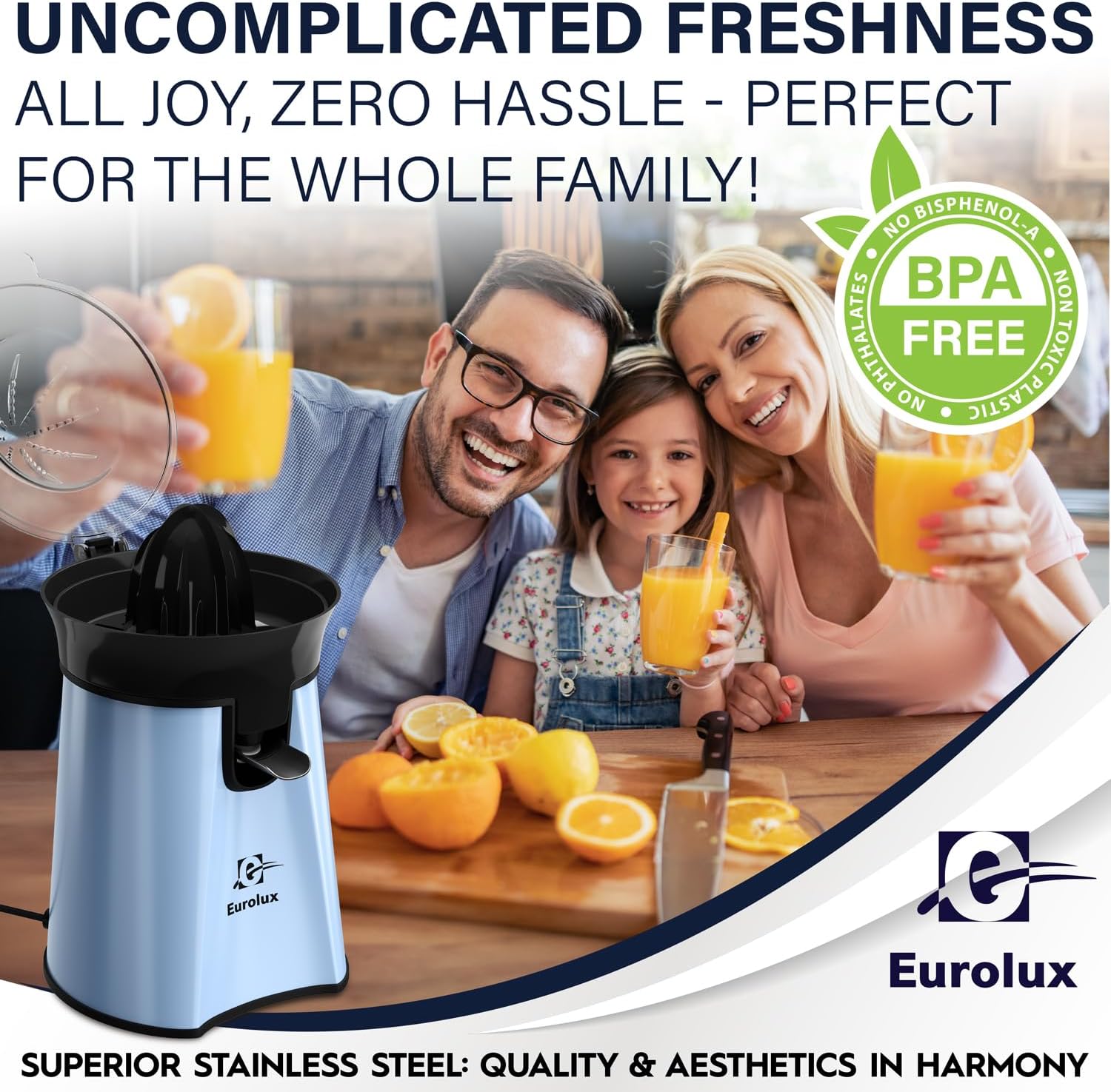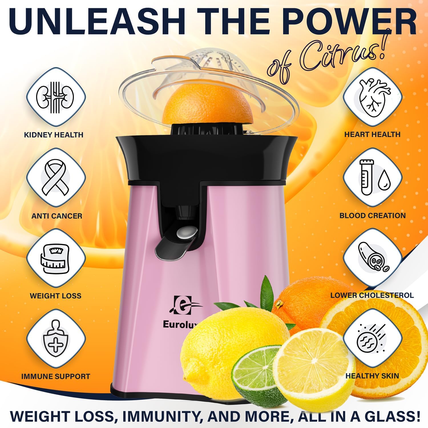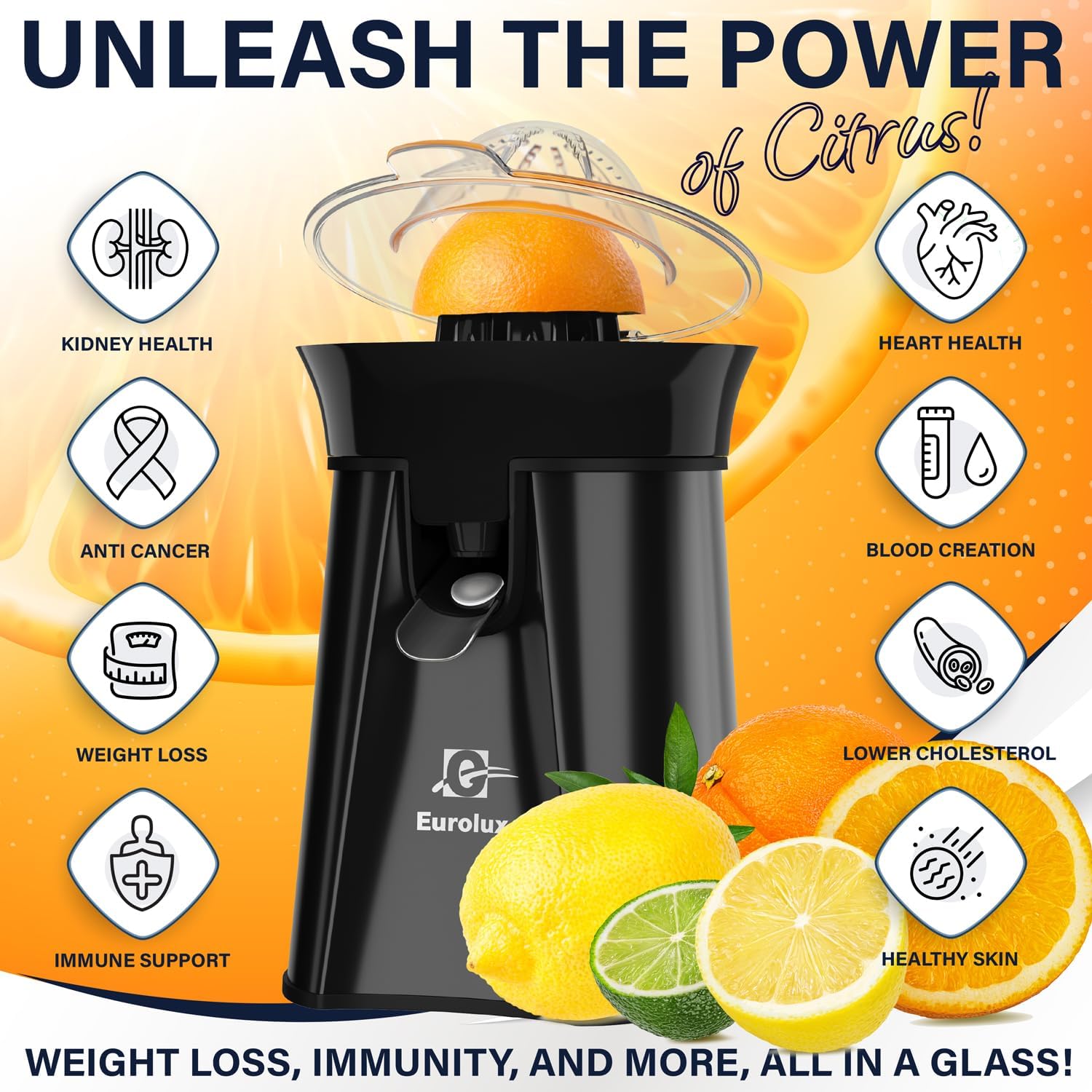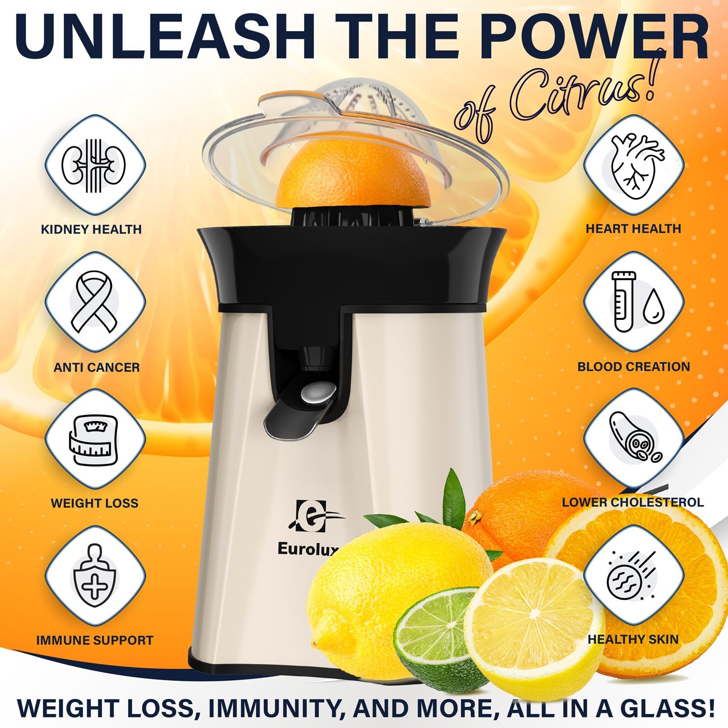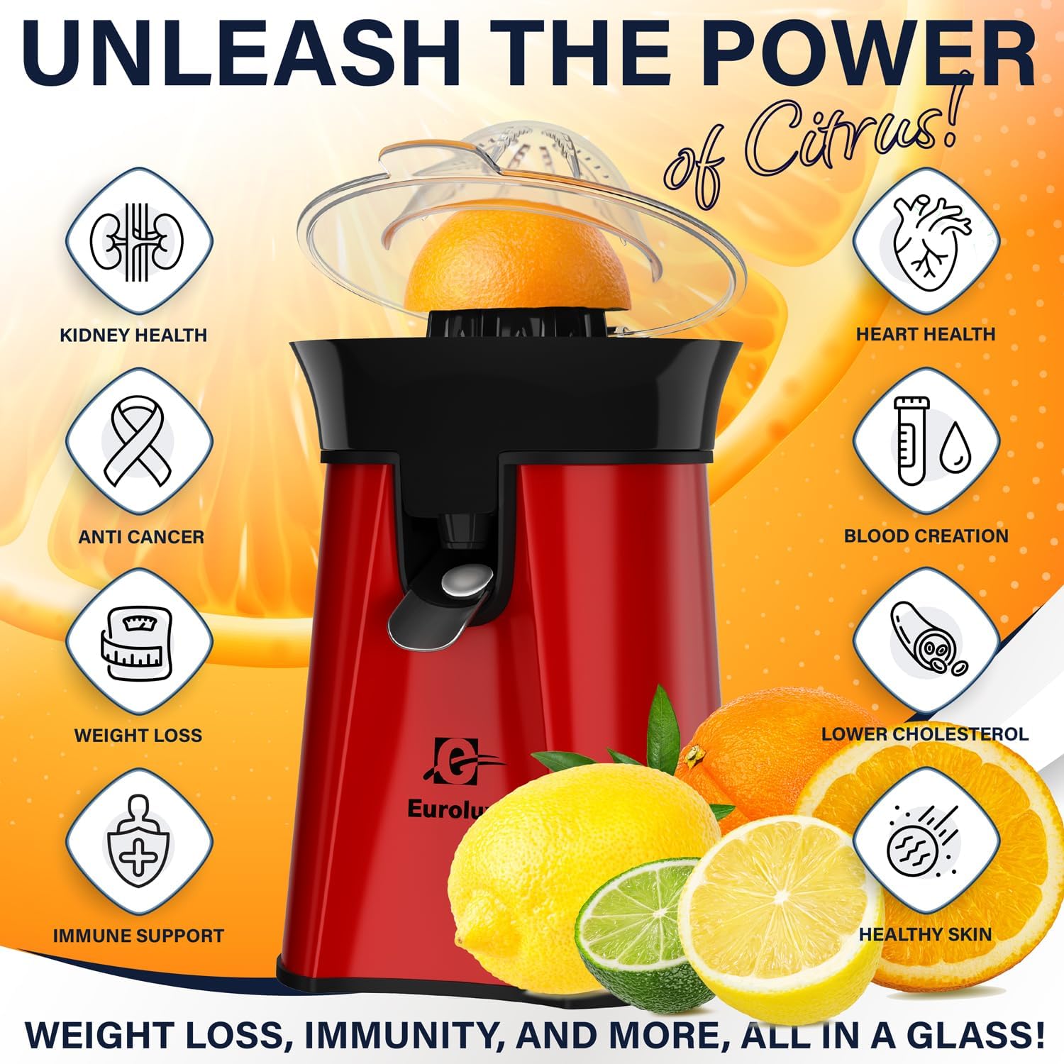Eurolux Premium Electric Orange Juicer | Stainless Steel Citrus Squeezer With New Ultra-Powerful Motor and Soft Grip Handle for Effortless Juicing, Auto Shutoff, Dishwasher-safe Parts, Pulp Control