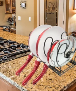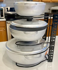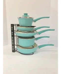 This metal pot storage organizing rack is great for storing your pots and pans in the cupboard, pantry, counter, and many more. rack features 5 adjustable width dividers – adjusts by .5 increments from .5 to 6.5 inch max width to ensure the correct fit. This rack maximizes storage potential while making it easy to store and find cookware. To adjust the dividers squeeze divider base together and slide into provided slots along sides of base. To clean simply wipe with a damp washcloth or mild detergent. Let air dry before using and storing. Made of sturdy, powder coated carbon steel. Measures approximately 12 inches in length by 6.12 inches width by 9.25 inches height over all.Â