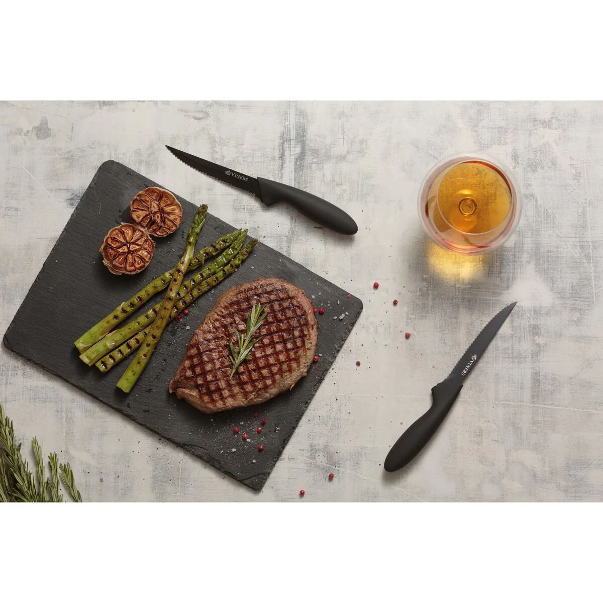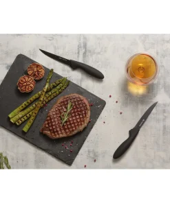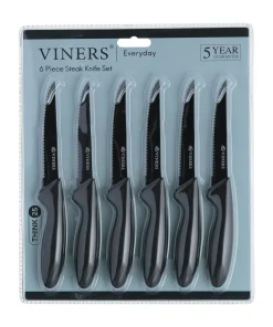 The Everyday steak knives are perfect for the effortless cutting of all meats. Crafted from quality stainless steel and non-stick coating, the serrated blades provide strength and durability. The curved handle provides maximum comfort and added grip, finished with a soft touch handle.