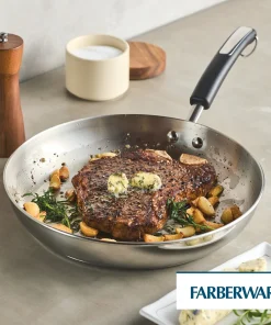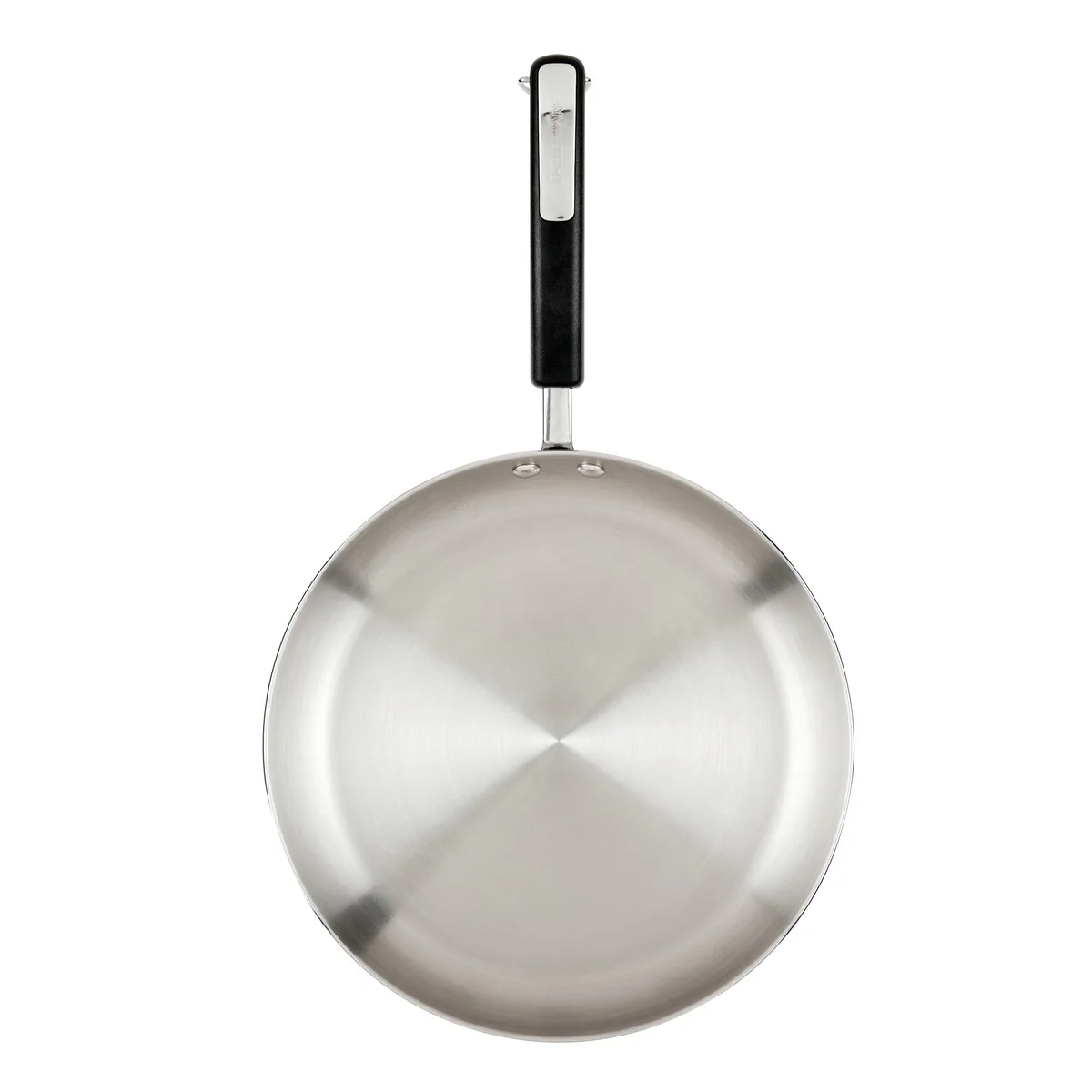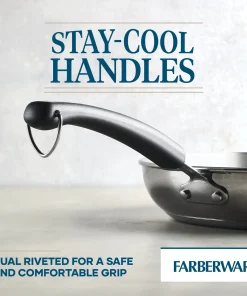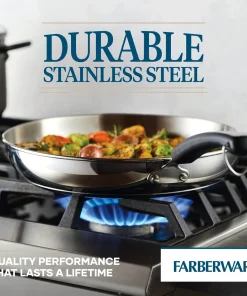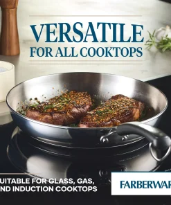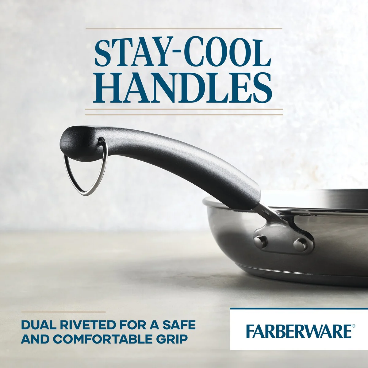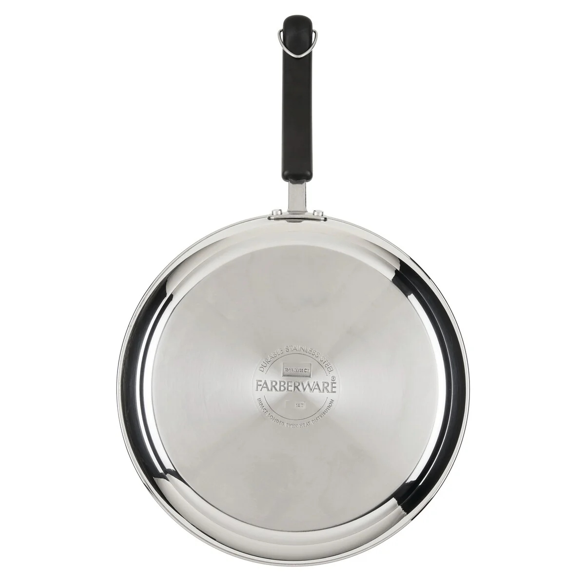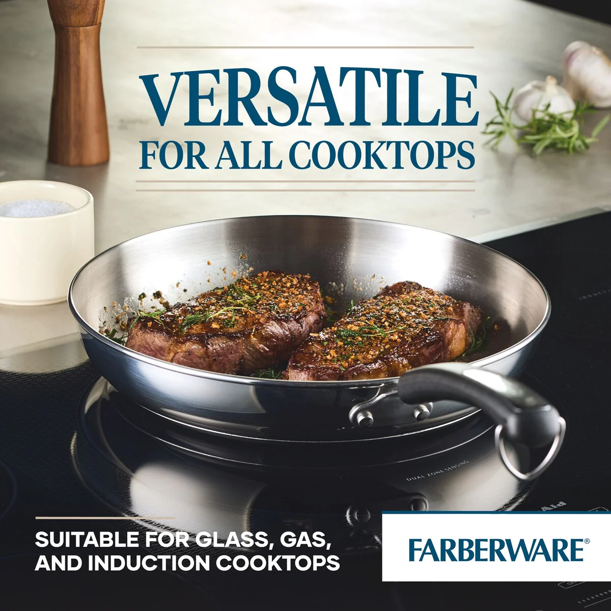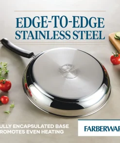 Your culinary future is bright with Farberware Brilliance, quality stainless steel cookware designed for versatile, everyday cooking and constructed for long-lasting performance. This durable stainless steel 12.25-inch frying pan features an edge-to-edge, fully encapsulated base that promotes even heating and is also suitable for all stovetops, including induction. This sealed-base design adds strength and structural integrity, which makes the fry pan truly dishwasher safe, and helps withstand wear and tear. The cookware includes practical features, like a stay-cool handle and rolled rim, for everyday convenience. With its distinctive polished sheen, Farberware Brilliance shines in any kitchen.