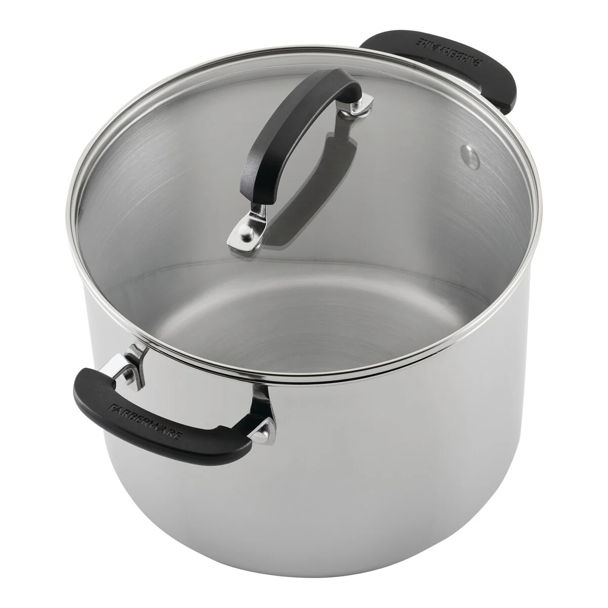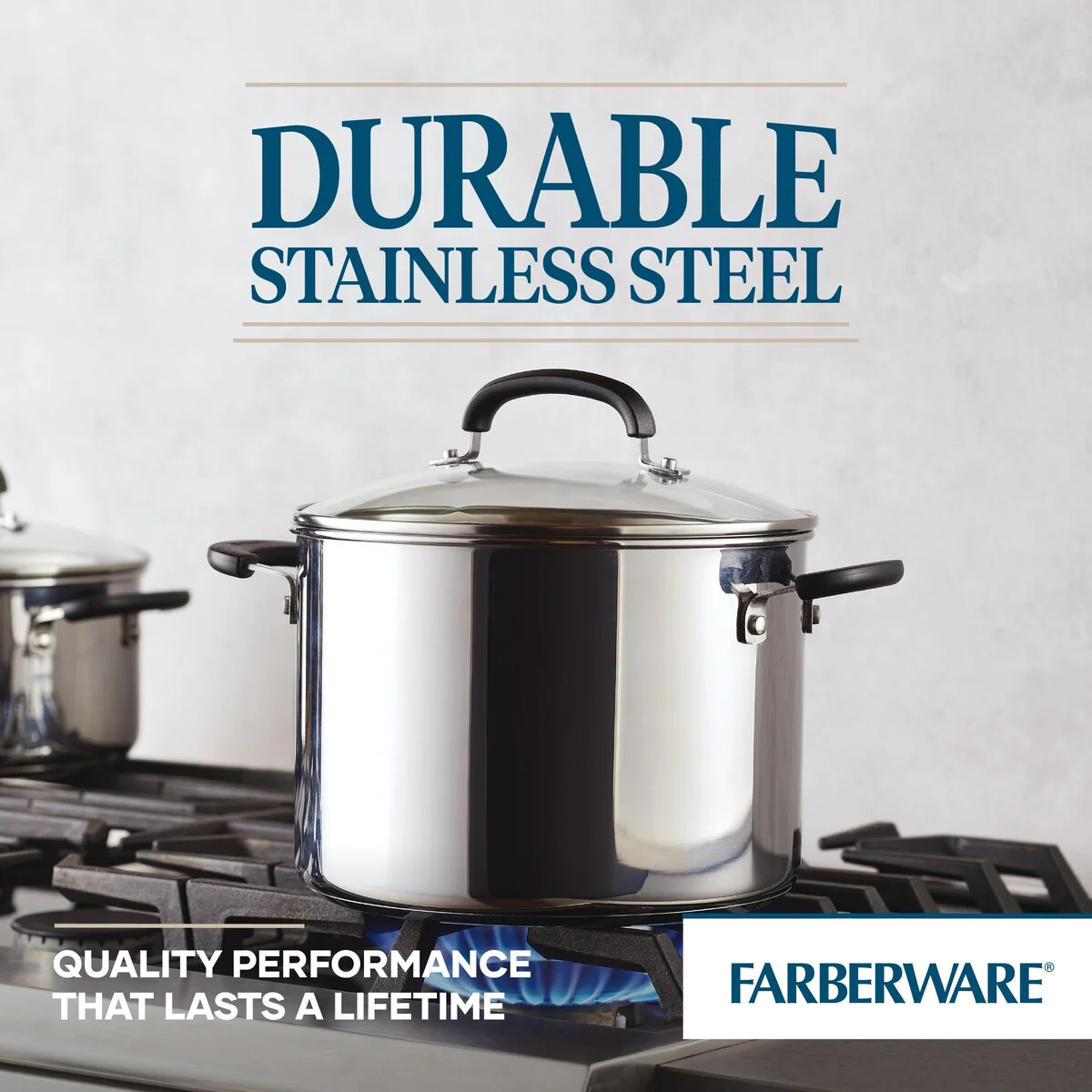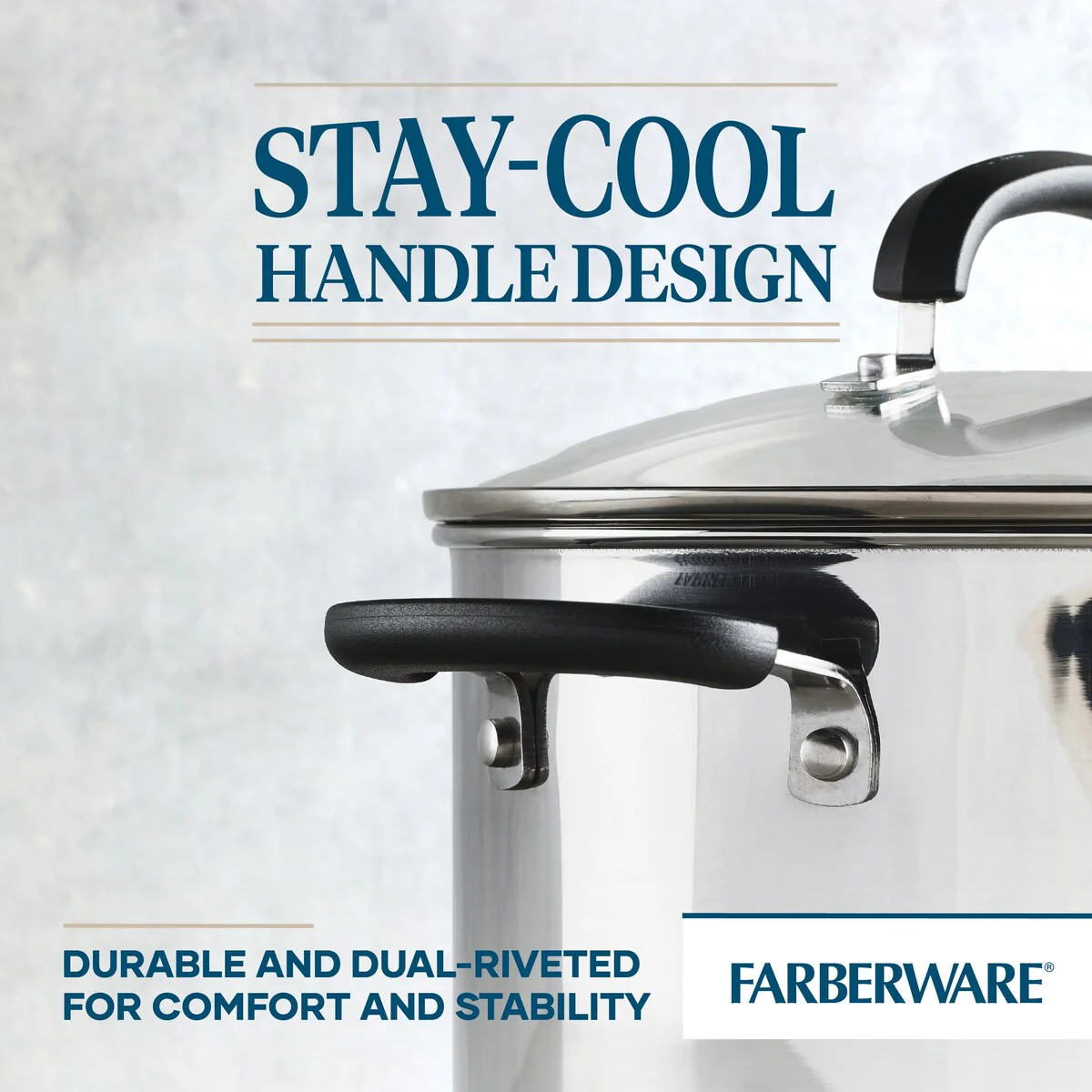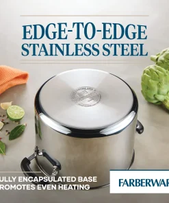 Your culinary future is bright with Farberware Brilliance, quality stainless steel cookware designed for versatile, everyday cooking and constructed for long-lasting performance. This durable stainless steel 8-quart stockpot with lid features an edge-to-edge, fully encapsulated base that promotes even heating and is also suitable for all stovetops, including induction. This sealed-base design adds strength and structural integrity, which makes the pot truly dishwasher safe, and helps withstand wear and tear. The cookware includes practical features, like a stay-cool handle and rolled rim, for everyday convenience. With its distinctive polished sheen, Farberware Brilliance shines in any kitchen.