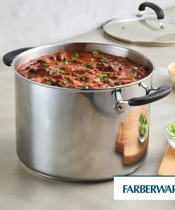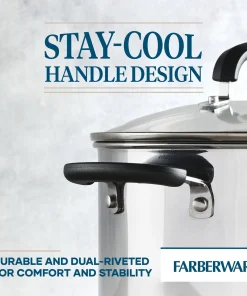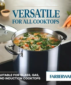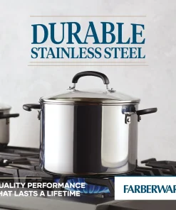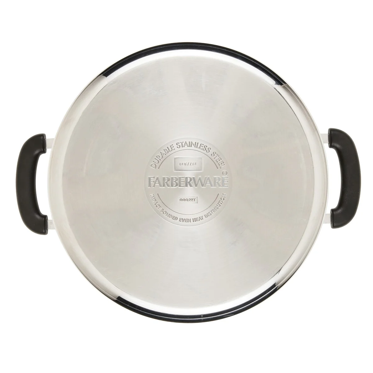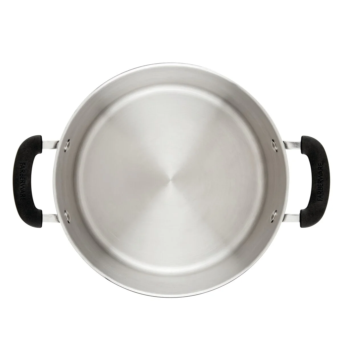 Your culinary future is bright with Farberware Brilliance, quality stainless steel cookware designed for versatile, everyday cooking and constructed for long-lasting performance. This durable stainless steel 8-quart stockpot with lid features an edge-to-edge, fully encapsulated base that promotes even heating and is also suitable for all stovetops, including induction. This sealed-base design adds strength and structural integrity, which makes the pot truly dishwasher safe, and helps withstand wear and tear. The cookware includes practical features, like a stay-cool handle and rolled rim, for everyday convenience. With its distinctive polished sheen, Farberware Brilliance shines in any kitchen.