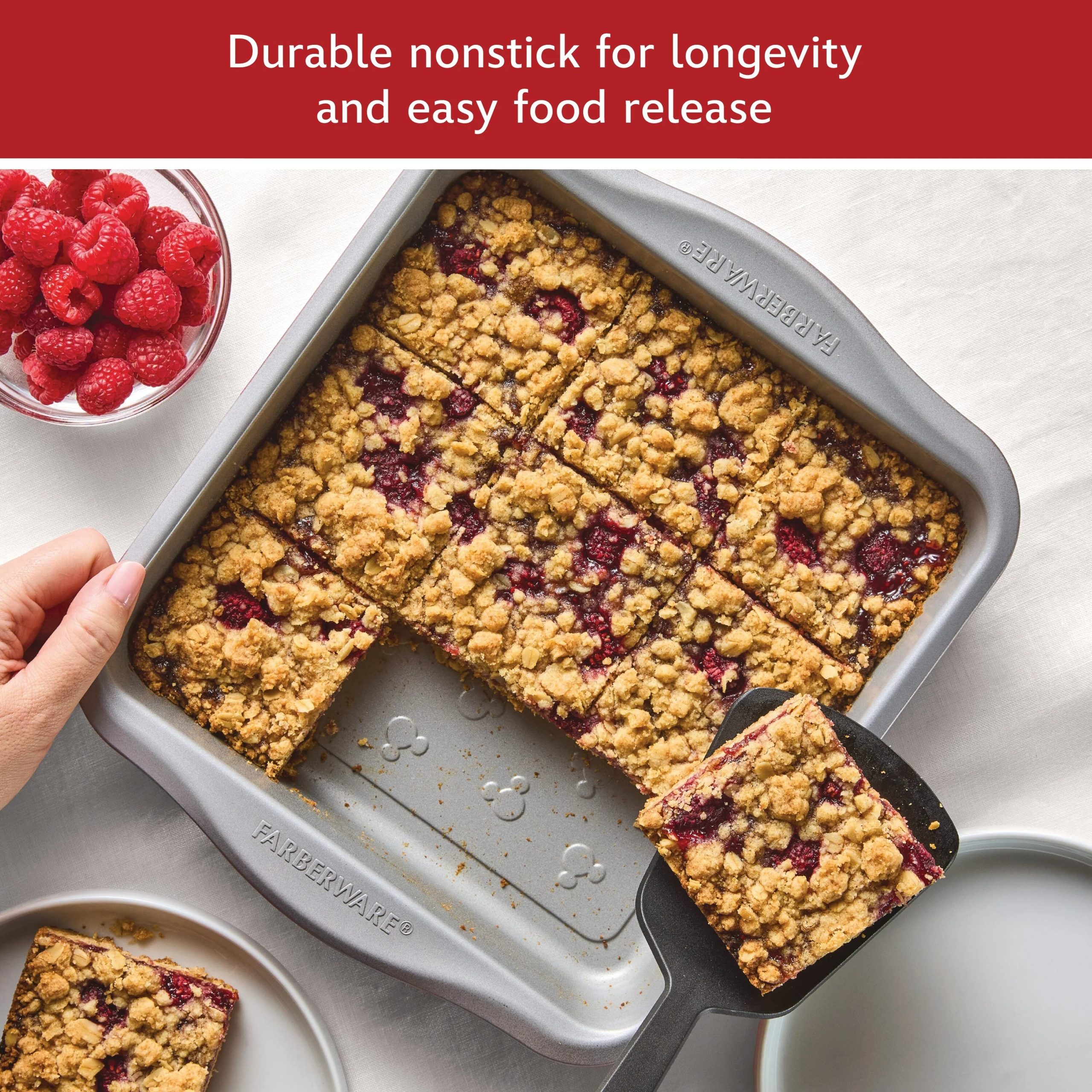 Create your favorite cakes, cookies, muffins, and more with the magic of Disney! This collection of bakeware from Farberware is inspired by Disney Mickey Mouse and brings the joy and fun of Disney into your kitchen. All four bakeware pieces in this set feature a pattern of Mickey’s iconic silhouette embossed into the baking surfaces. These durable baking pans, which reliably resist warping and heat evenly, also brown beautifully and help reduce hot spots that can burn baked goods. Their nonstick interiors deliver great food release for sweet or savory treats – all with quick cleanup. This collection combines classic bakeware designs and contemporary functionality with more than 120 years of Farberware’s trusted culinary performance and the nostalgic charm of classic Disney. (Copyright: Disney).