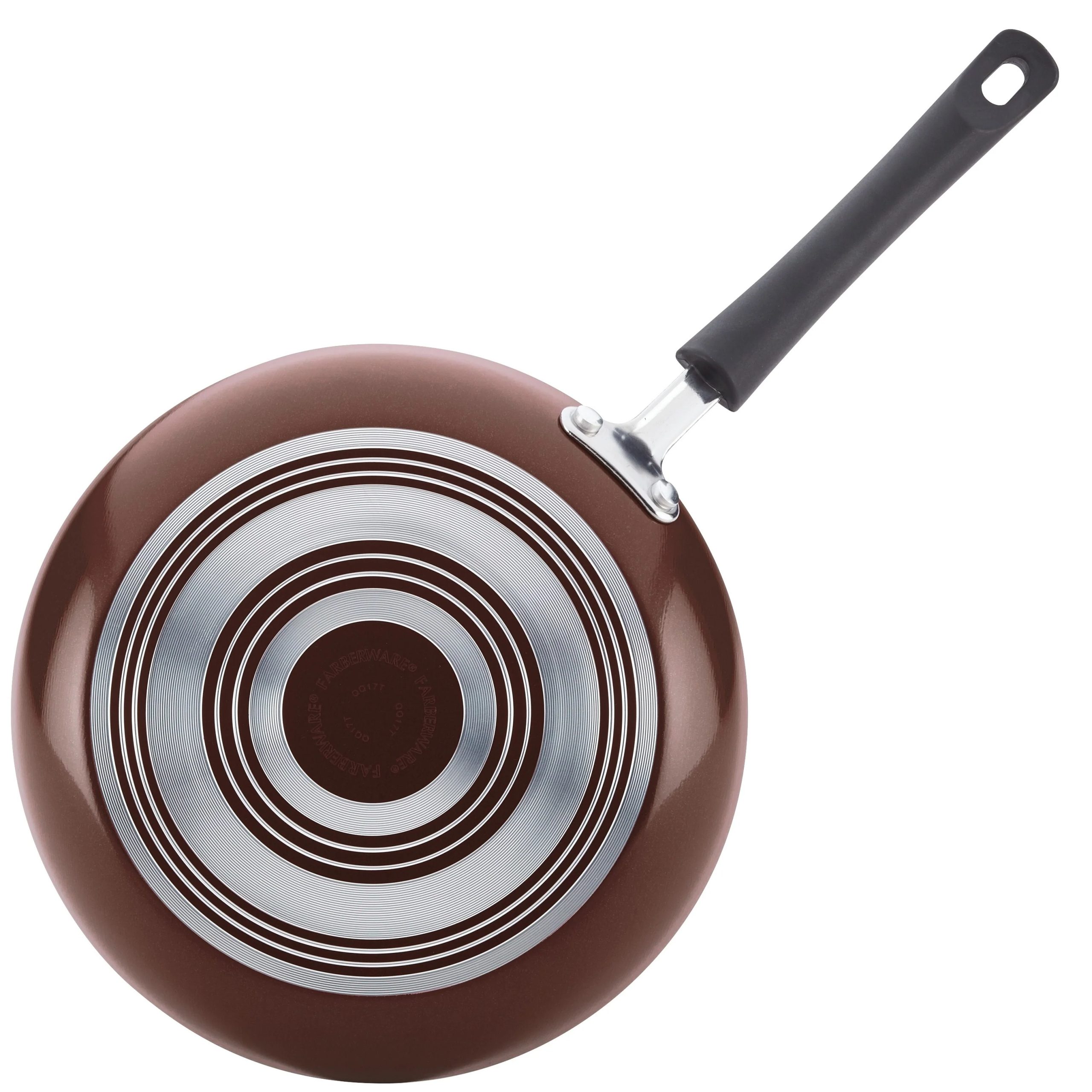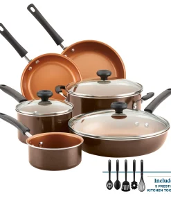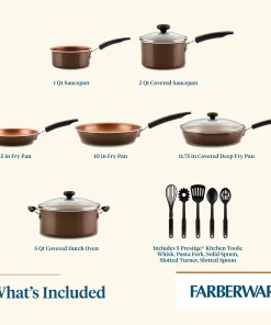 Equip the kitchen with the quality performance home cooks have depended on since 1900 with the dishwasher-safe Farberware Easy Clean Aluminum Nonstick 14-Piece Cookware Set. This huge set of essentials includes all of the saucepans, frying pans, and pots you’ll ever need for easy, convenient, everyday cooking. Long-lasting nonstick interiors provide excellent food release for family favorite recipes, and colorful exteriors add a touch of style to any kitchen. Heavy-duty aluminum heats quickly and evenly, and is oven safe to 350°F. The strong handles provide a confident grip, and glass lids seal in heat and flavor while you watch foods cook. Plus, this kitchen pots and pans set comes with five Prestige kitchen utensils so you can jump into recipes right away.