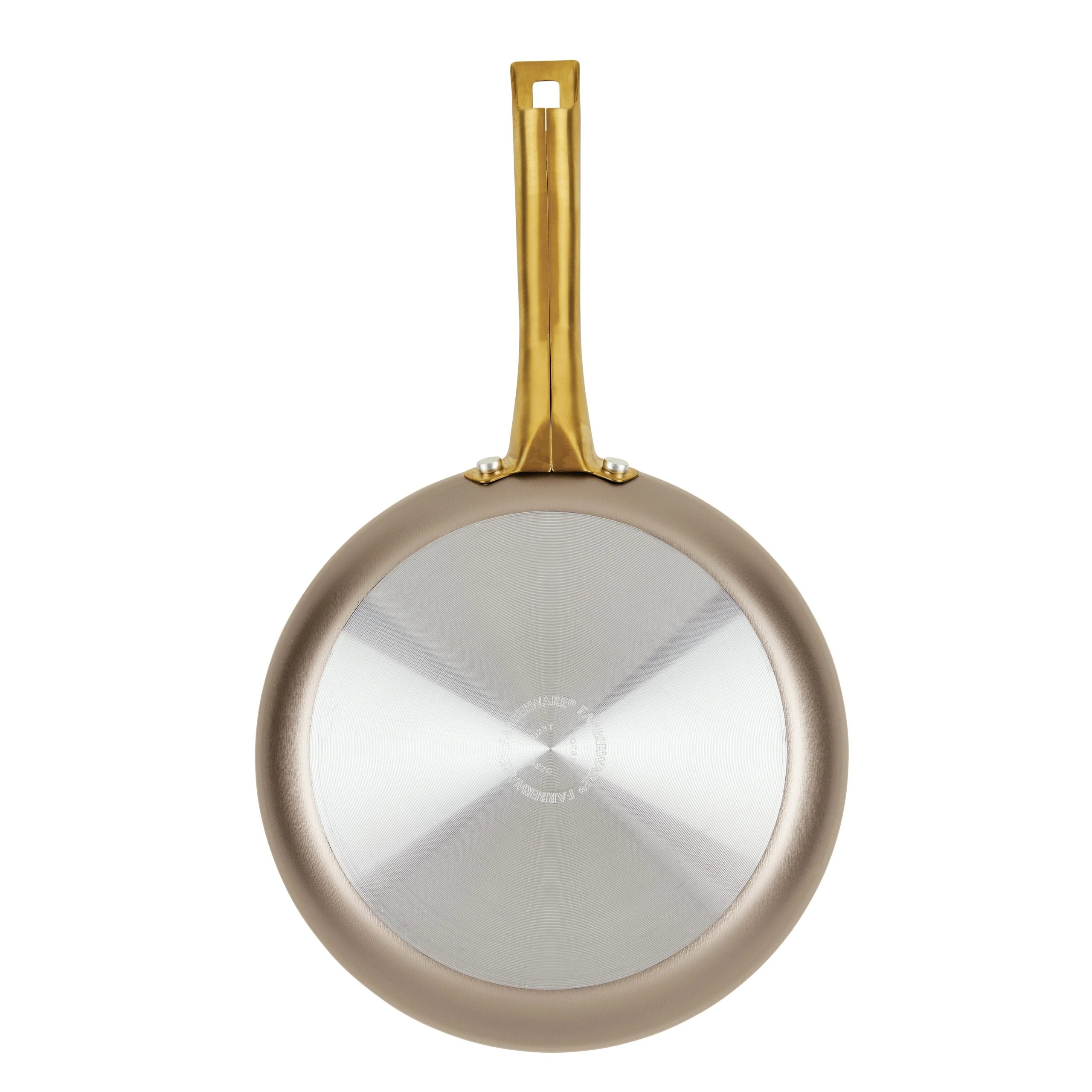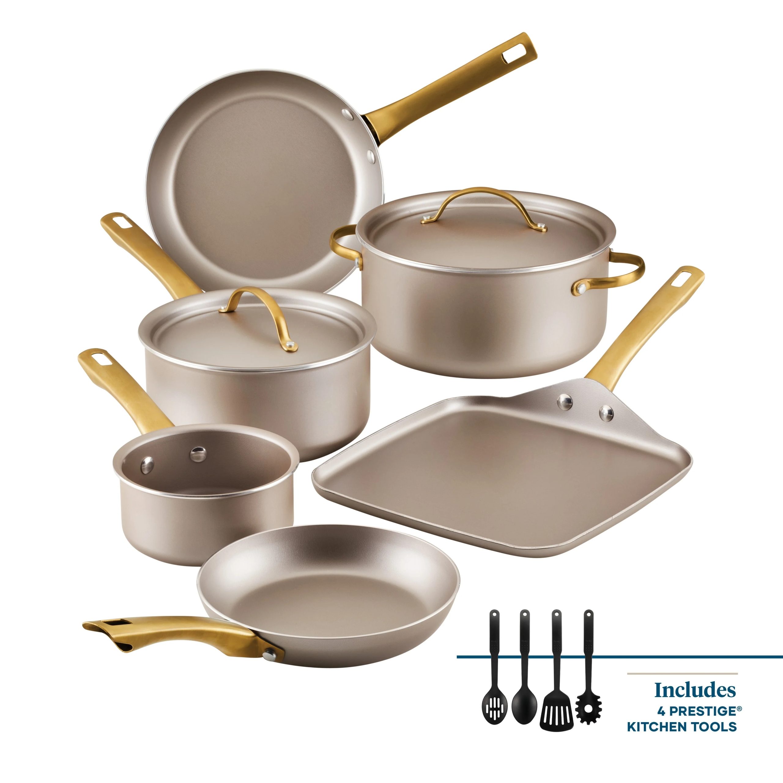 - RADIANT STYLE: With contemporary champagne-colored surfaces, color-matched lids (that fit pots and pans), and sleek gold stainless steel handles that are the ultimate on-trend accents, this cookware makes a statement in any kitchen.