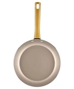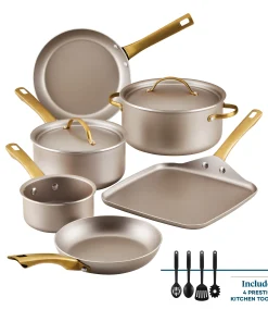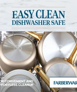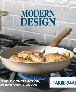 These statement-making pots and pans radiate style, with a contemporary champagne-colored surface inside and out, color-matched lids (that fit pots and pans), and sleek gold stainless steel handles that are the ultimate on-trend accents. Beyond good looks, this cookware delivers superior performance for everyday reliability, supported by more than 120 years of Farberware’s trusted quality. Features include a durable nonstick cooking surface for super smooth food release and easy cleaning; aluminum construction for fast, even heat distribution, and flared rims on saucepans and Dutch oven for mess-free pouring. They’re also dishwasher safe and oven safe to 350 degrees F, and the set includes four essential cooking tools. Elevated designs, everyday performance, trusted quality.Â