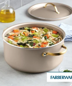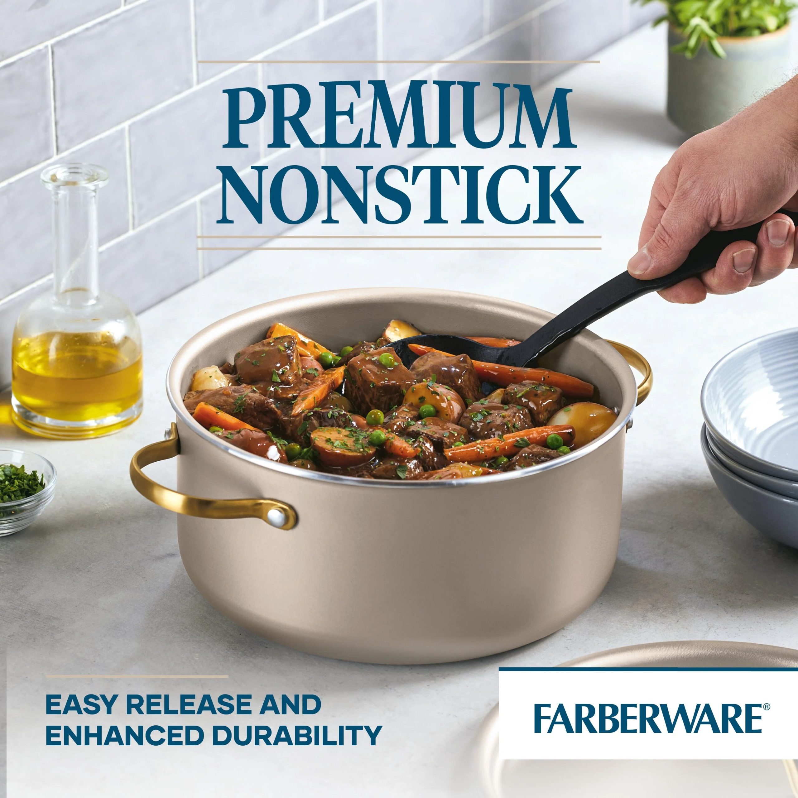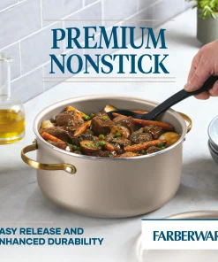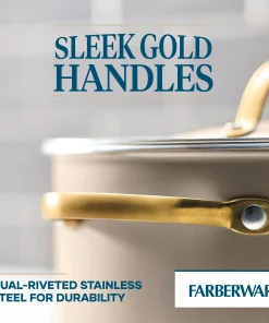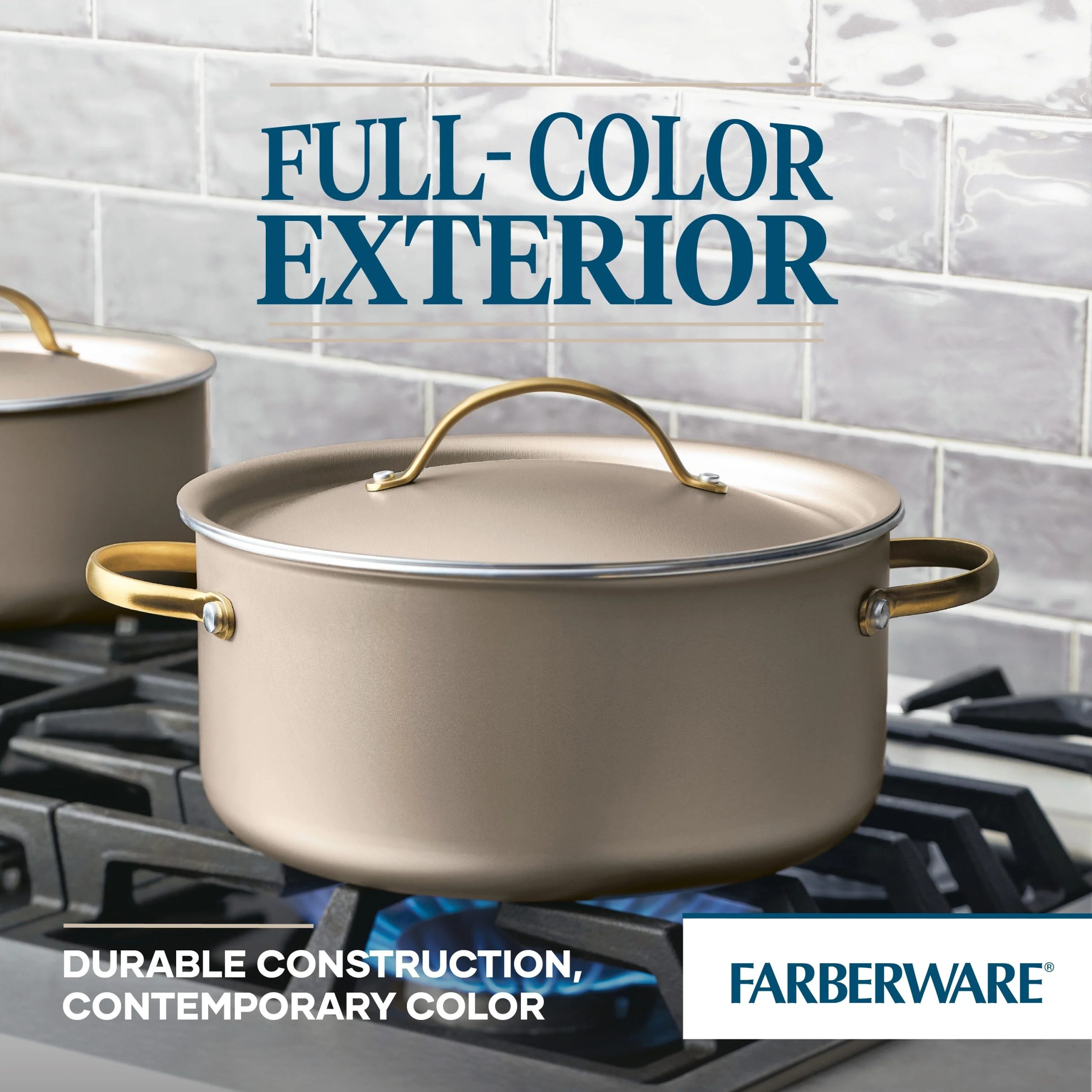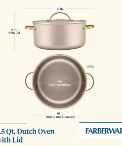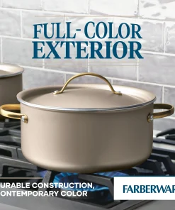 This statement-making Dutch oven radiates style, with a contemporary champagne-colored surface inside and out, color-matched lid, and sleek gold stainless steel handles that are the ultimate on-trend accents. Beyond good looks, this Dutch oven delivers superior performance for everyday reliability, supported by more than 120 years of Farberware’s trusted quality. Features include a durable nonstick cooking surface for super smooth food release and easy cleaning; aluminum construction for fast, even heat distribution, and a flared rim for mess-free pouring. It’s also dishwasher safe and oven safe to 350 degrees F. Elevated design, everyday performance, trusted quality.Â