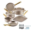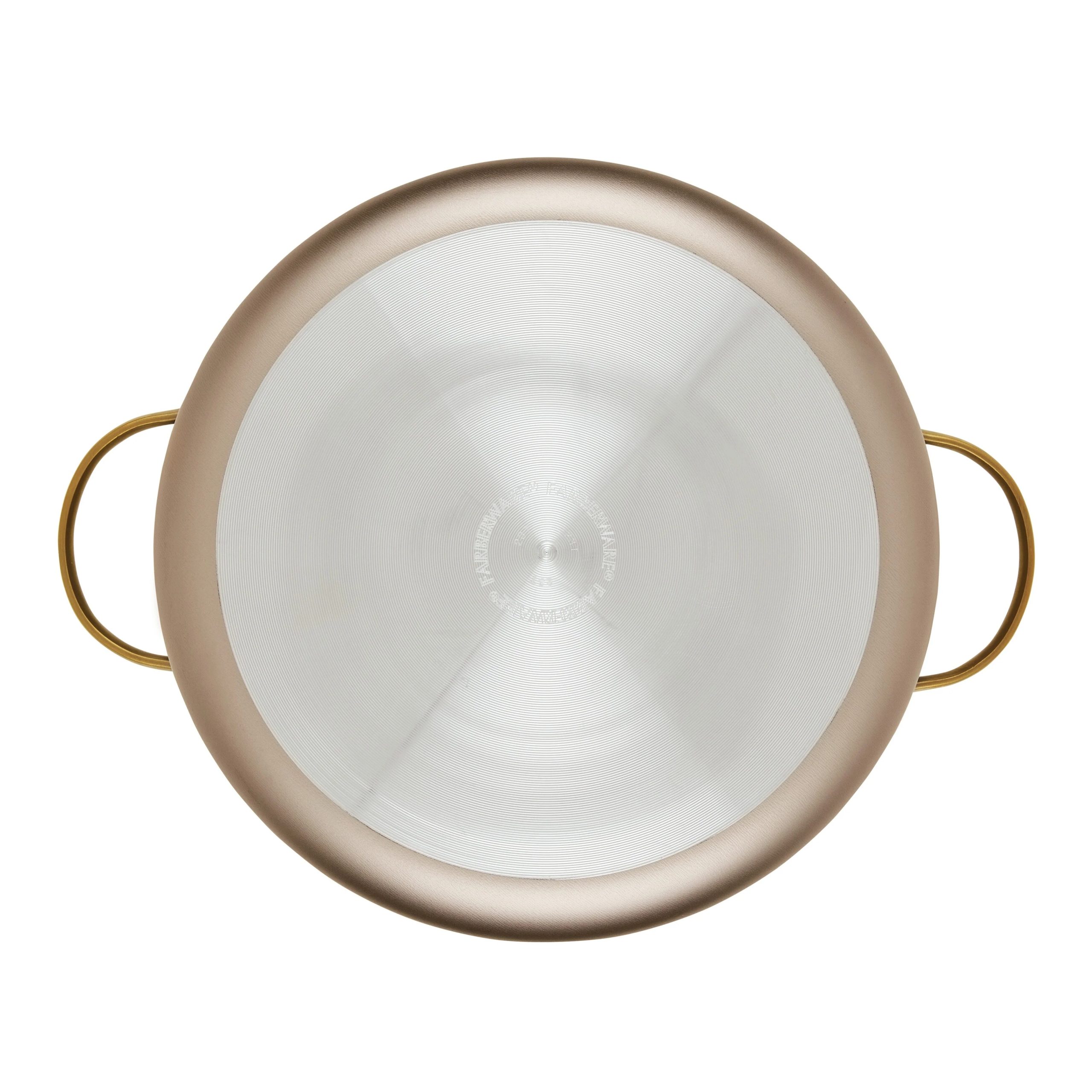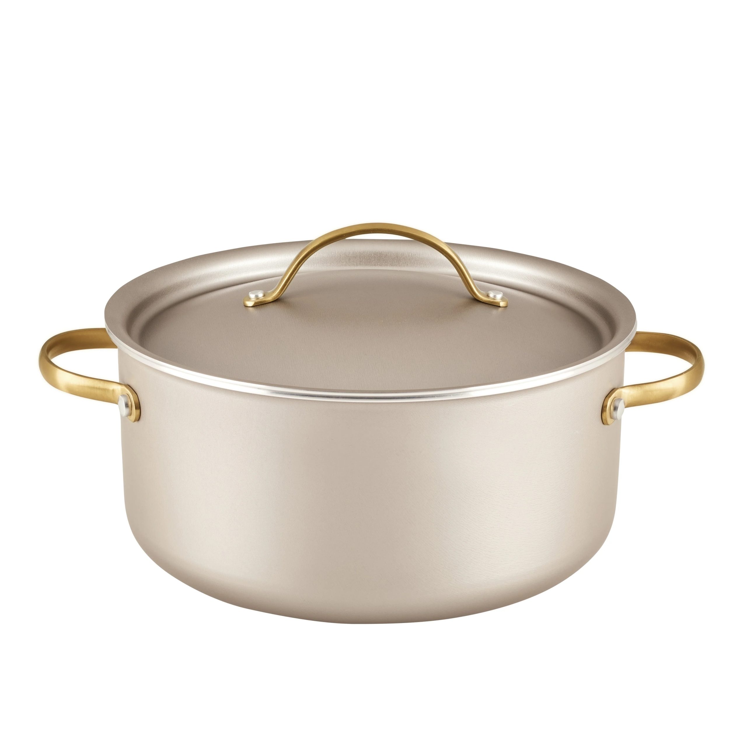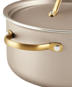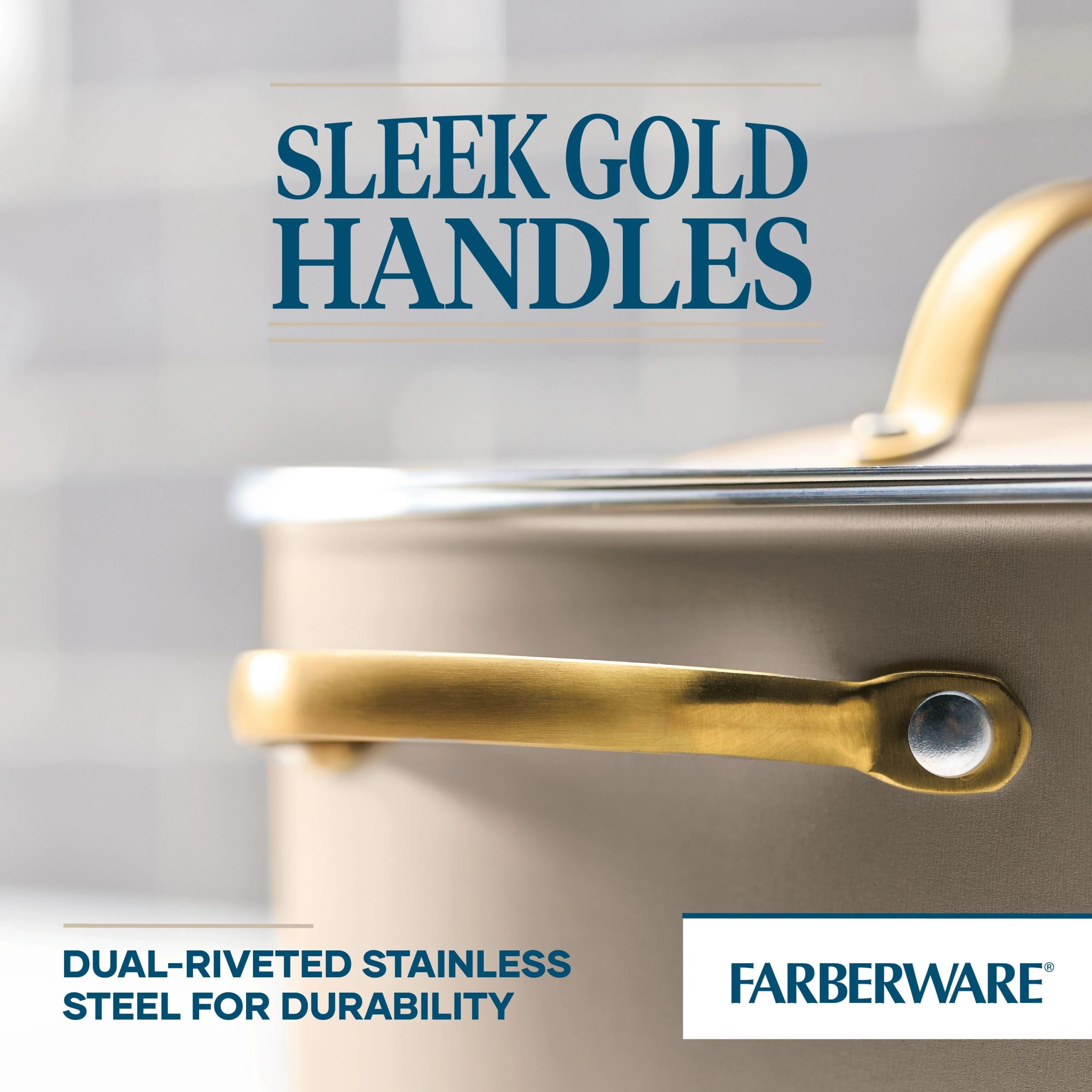 This statement-making Dutch oven radiates style, with a contemporary champagne-colored surface inside and out, color-matched lid, and sleek gold stainless steel handles that are the ultimate on-trend accents. Beyond good looks, this Dutch oven delivers superior performance for everyday reliability, supported by more than 120 years of Farberware’s trusted quality. Features include a durable nonstick cooking surface for super smooth food release and easy cleaning; aluminum construction for fast, even heat distribution, and a flared rim for mess-free pouring. It’s also dishwasher safe and oven safe to 350 degrees F. Elevated design, everyday performance, trusted quality.Â