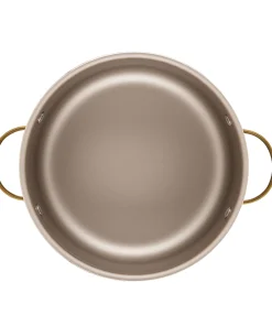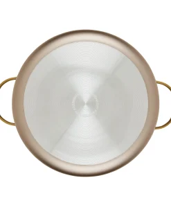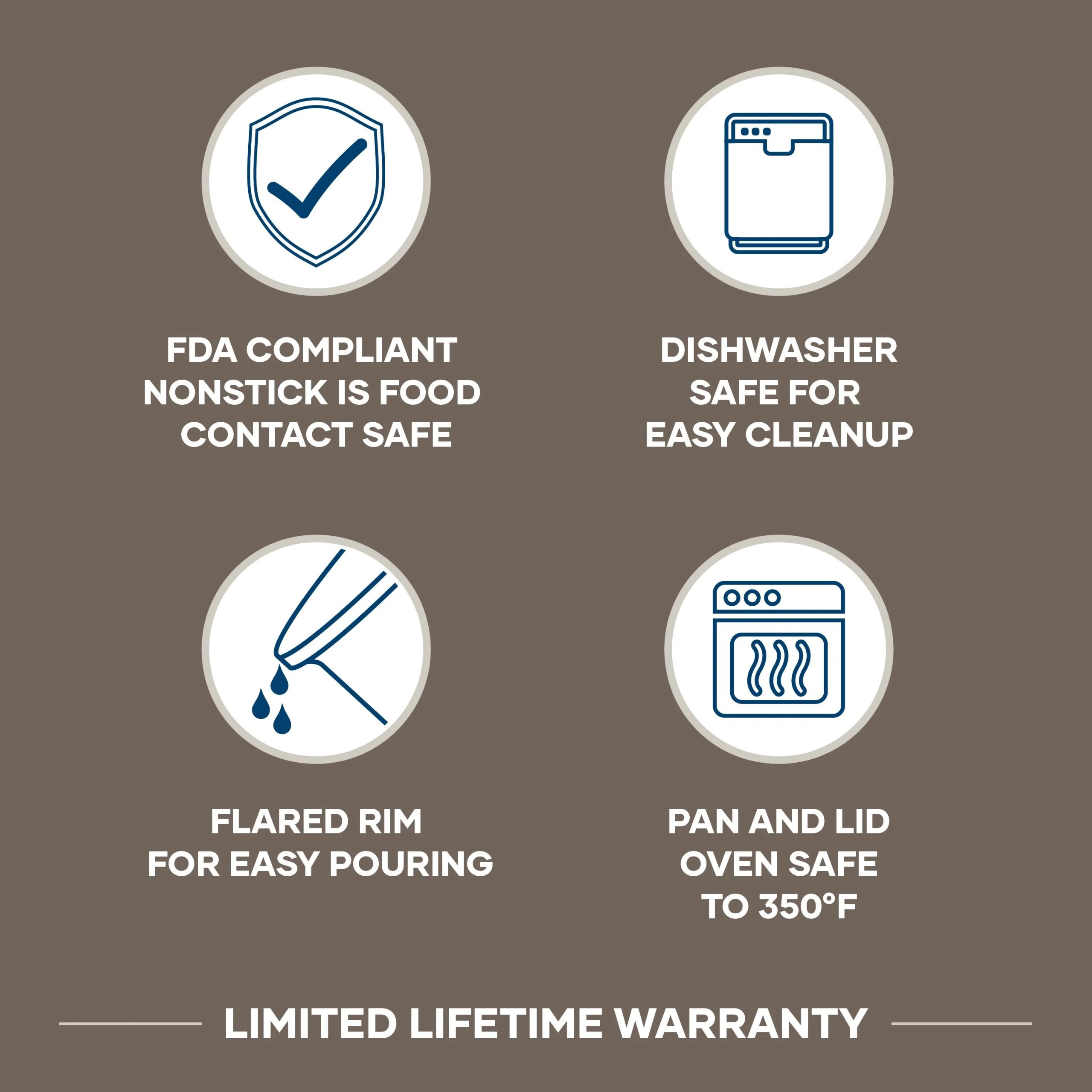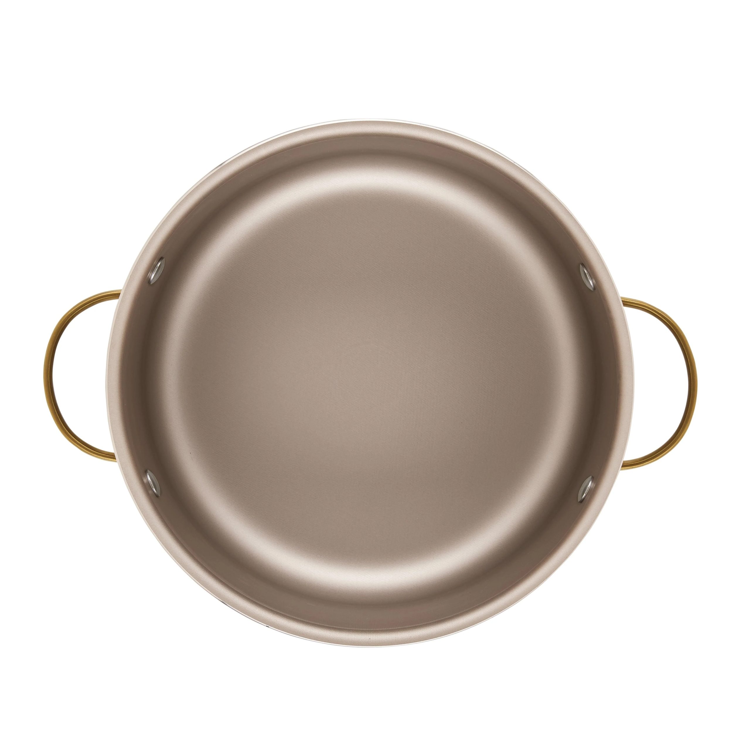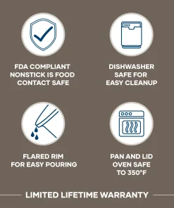 - STURDY HANDLES: Gold-toned stainless steel handle is dual-riveted for sturdy transport from stove to oven to table. Cookware and lid are oven safe up to   350 degrees F. For your safety, always remember to use oven mitts when handling hot cookware.   Â