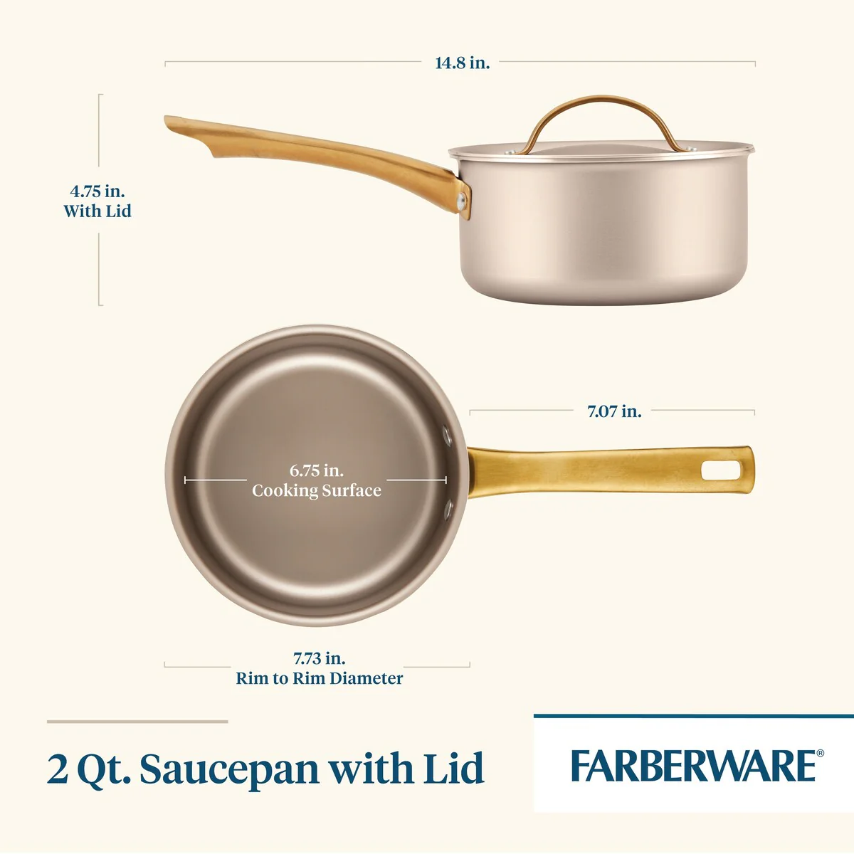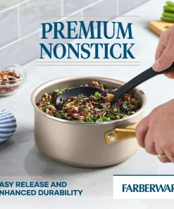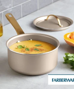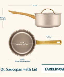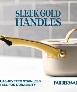 This statement-making saucepan radiates style, with a contemporary champagne-colored surface inside and out, color-matched lid, and sleek gold stainless steel handle that is the ultimate on-trend accent. Beyond good looks, this saucepan delivers superior performance for everyday reliability, supported by more than 120 years of Farberware’s trusted quality. Features include a durable nonstick cooking surface for super smooth food release and easy cleaning; aluminum construction for fast, even heat distribution, and a flared rim for mess-free pouring. It’s also dishwasher safe and oven safe to 350 degrees F. Elevated design, everyday performance, trusted quality.Â