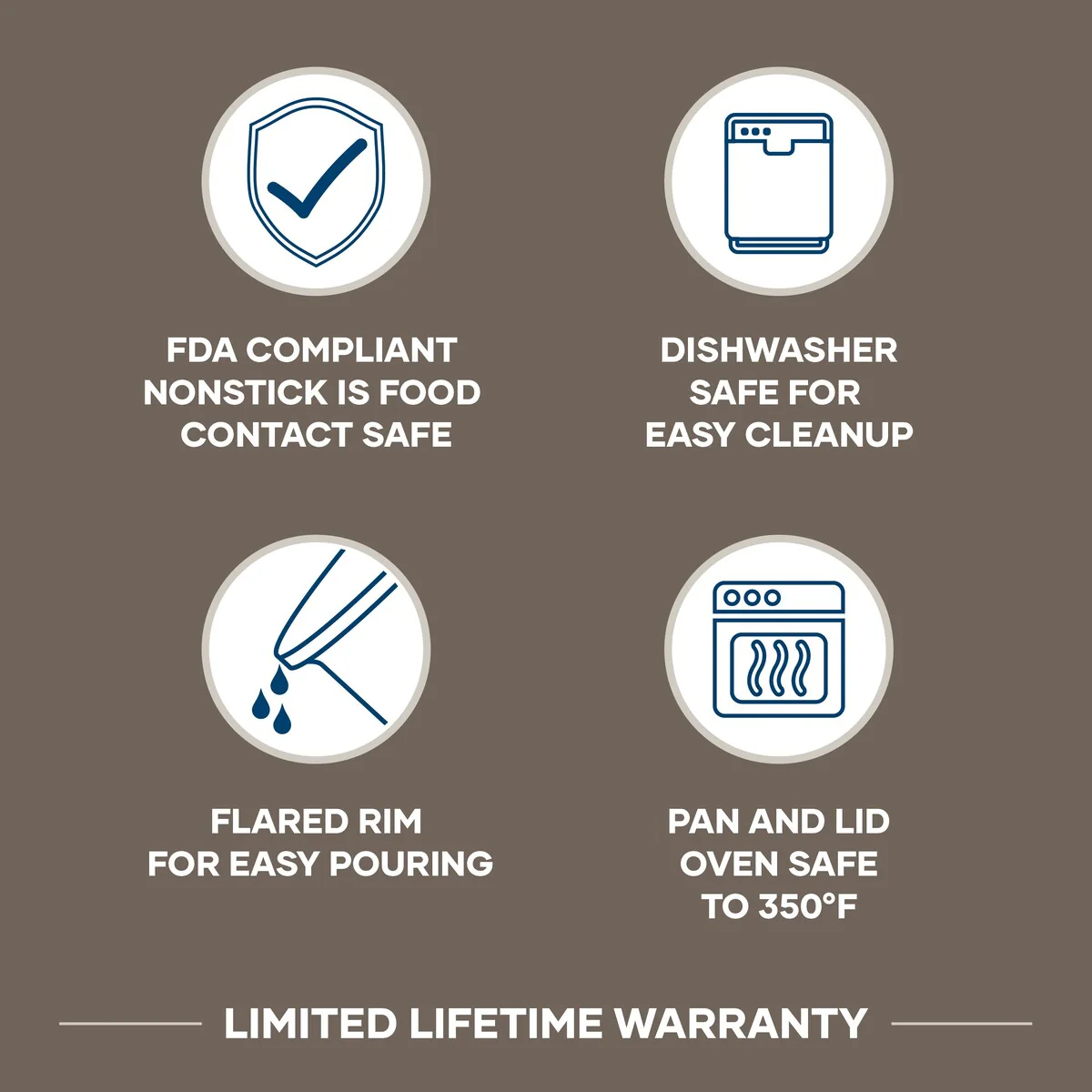 - STURDY HANDLES: Gold-toned stainless steel handle is dual-riveted for sturdy transport from stove to oven to table. Cookware and lid are oven safe up to 350 degrees F. For your safety, always remember to use oven mitts when handling hot cookware.Â