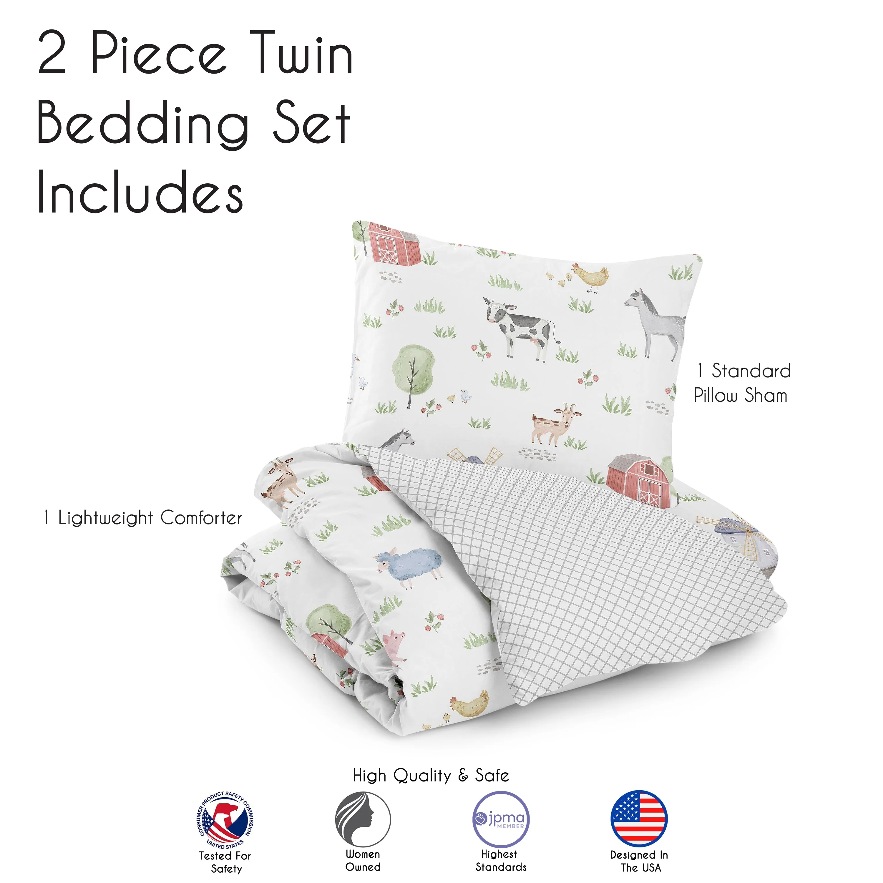 Ā Ā Ā Ā Ā Transform Ā Ā your child’s bedroom into a cozy and stylish retreat with our 2pc On The Farm Ā Ā kids bedding sets for boys by Sweet Jojo Designs. Designed for people who Ā Ā love both style and comfort, this twin size bedding set features vibrant Ā Ā colors and fun patterns. This twin bedding comforter sets for boys uses a Ā Ā sensational collection of exclusive, brushed microfiber fabrics. This Ā Ā all-in-one twin bed in a bag set includes a super-soft twin blanket and a Ā Ā matching pillow sham, offering the perfect blend of warmth, comfort and Ā Ā durability. The soft comforter features hand painted watercolor farmhouse Ā Ā print complete with pigs, horses, goats, geese, chickens and sheep along with Ā Ā a coordinating lattice print. The neutral but bold color palette of reds, Ā Ā blues, yellows and greens with grey accents will set your bedroom up in high Ā Ā style. This versatile collection has you covered with the perfect toddler Ā Ā twin bedding set for any farm lover in your family. Our twin bedding sets for Ā Ā children provide softness & quality, making it perfect for those who Ā Ā appreciate luxury bedding without the hefty price tag. Whether you’re Ā Ā updating your guest bedroom essentials, need extra bedding, or upgrading your Ā Ā child’s room, this twin bedding set is a must-have. This boys bedding sets Ā Ā twin by Sweet Jojo Designs will fit all standard twin size beds. 2PC TWIN Ā Ā BEDDING SETS FOR BOYS OR GIRLS INCLUDES: Lightweight Comforter (62in. x Ā Ā 86in.) & Standard Sham (20in. x 26in.). Easy machine washable and dryable Ā Ā on low. This farm animals twin comforter set for boys is made with super Ā Ā soft, moisture wicking brushed microfiber fabric and features bold farmhouse Ā Ā color palette of reds, blues, yellows and greens with grey. BARN ANIMALS THEME: This twin boys bedding Ā Ā set boasts a soft blanket & pillow case sham. The bed comforter features Ā Ā hand painted animals such as cow, horse, sheep, pig, goat & chickens that Ā Ā reverses to a gray lattice print. This twin bed set has a matching pillow Ā Ā sham with the same animal print.