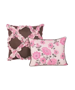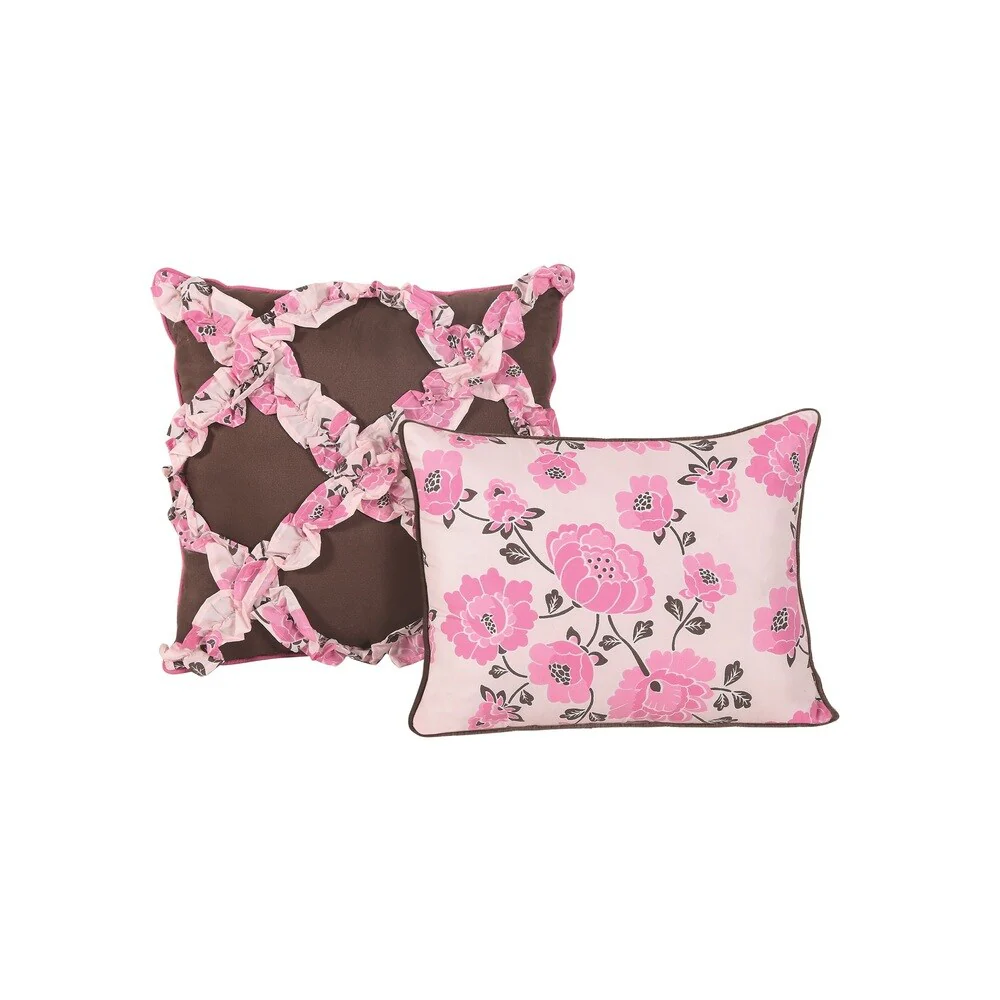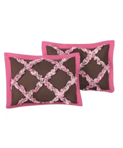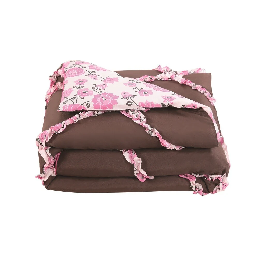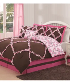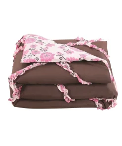 The sweetly innocent Farrah set is a beautiful brown and pink reversible bedding set and a fantastic way to update a growing girl’s room. This coordinated bedding set includes a comforter, bedskirt, two pillow shams and two decorative pillows.