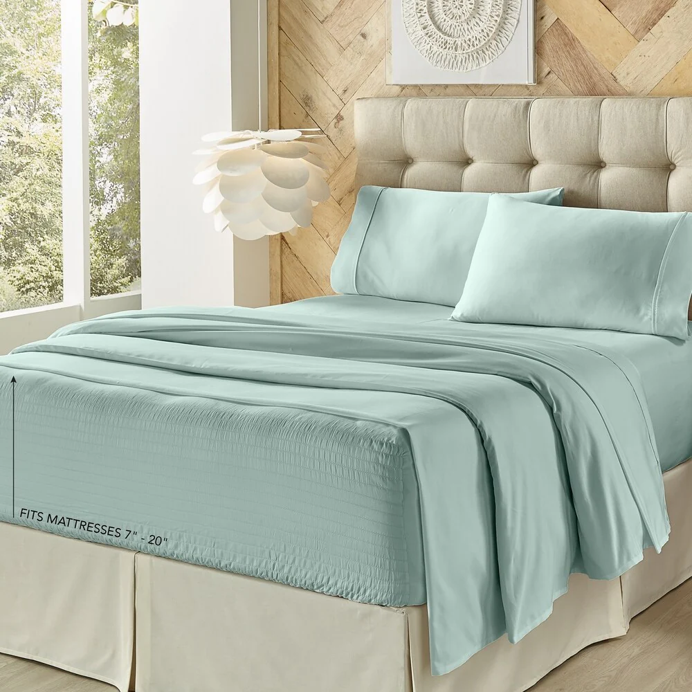 Add a luxurious feel to your bedding with this super soft 4-piece sheet set by Five Queens Court. Featuring Royal Fit Technology, a patented design, which guarantees to fit every mattress perfectly, every time. The unique fitted sheet construction stretches to fit the deepest mattress, mattress toppers, and works great with smaller low-profile mattresses (7" – 20"). Unlike most fitted sheets that do not fit well or stay in place throughout the night, our fitted sheet solution will never shift or slip-off. The luxuriously soft 800 thread count Alpha Cotton? fabric adds durability, gives the sheet set a silky-smooth hand-feel, and it is machine-washable. Available in multiple on-trend fashionable colors to fit any bedroom decor. The sheet set includes a flat sheet, fitted sheet, and two pillowcases (one pillowcase in twin set).