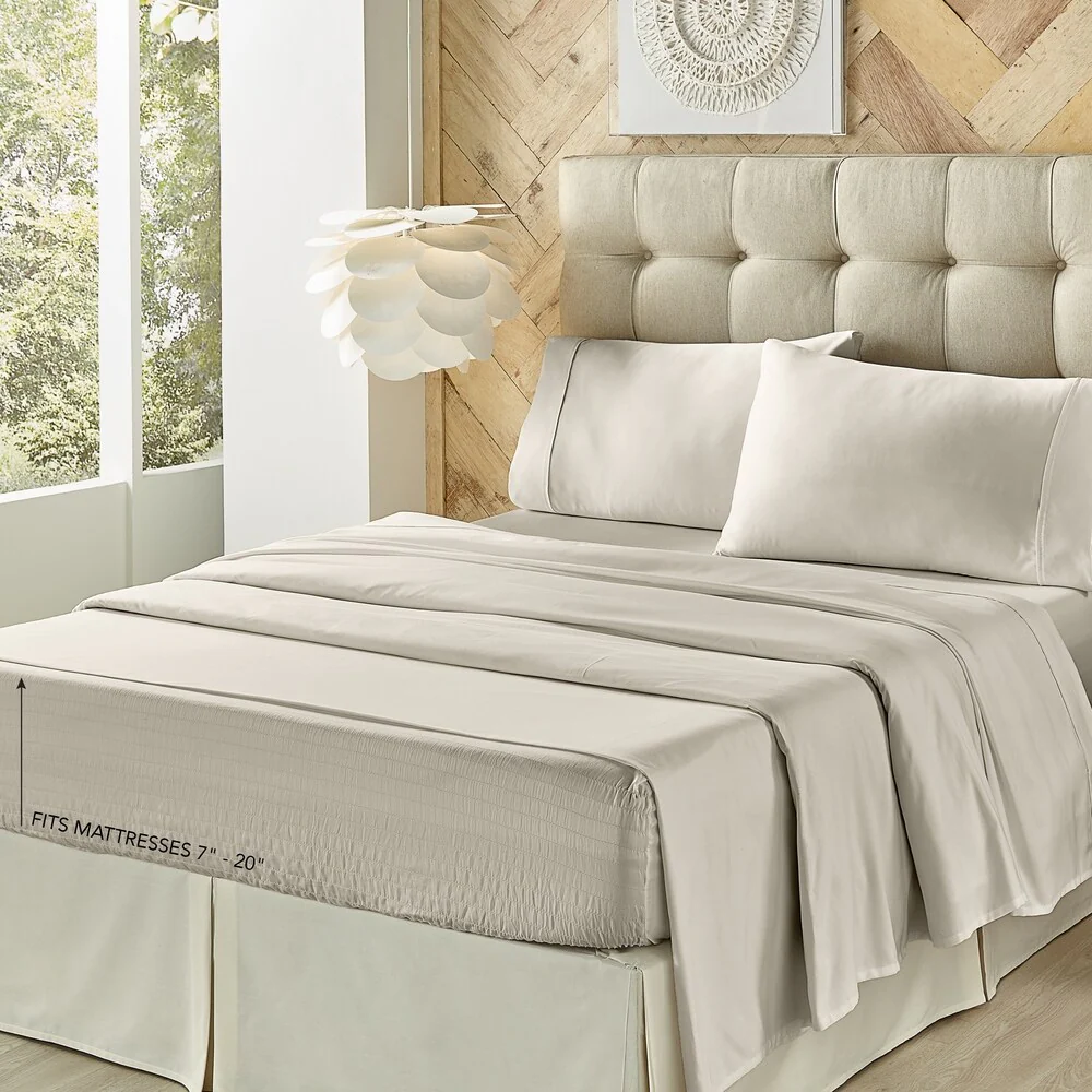 Add a luxurious feel to your bedding with this super soft 4-piece sheet set by Five Queens Court. Featuring Royal Fit Technology, a patented design, which guarantees to fit every mattress perfectly, every time. The unique fitted sheet construction stretches to fit the deepest mattress, mattress toppers, and works great with smaller low-profile mattresses (7" – 20"). Unlike most fitted sheets that do not fit well or stay in place throughout the night, our fitted sheet solution will never shift or slip-off. The luxuriously soft 800 thread count Alpha Cotton? fabric adds durability, gives the sheet set a silky-smooth hand-feel, and it is machine-washable. Available in multiple on-trend fashionable colors to fit any bedroom decor. The sheet set includes a flat sheet, fitted sheet, and two pillowcases (one pillowcase in twin set).