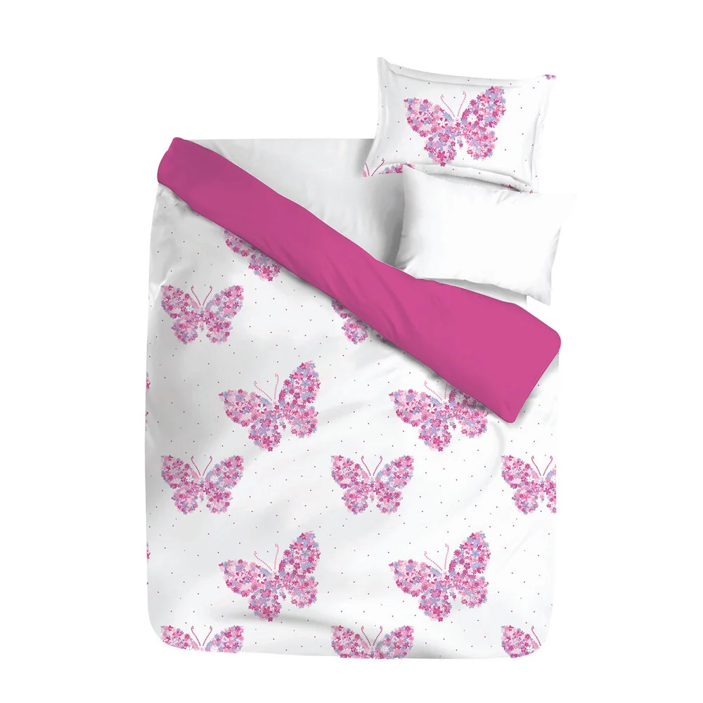 Update the look of your little girls bedroom with this stunning comforter and sham set from Beco Home. The pink and lilac butterflies are settling on the comforter and sham face, but look closely and you’ll see lots of tiny flowers! The set reverses to a solid hot pink and is machine washable for easy care. Each set includes comforter and two shams (one for Twin size).