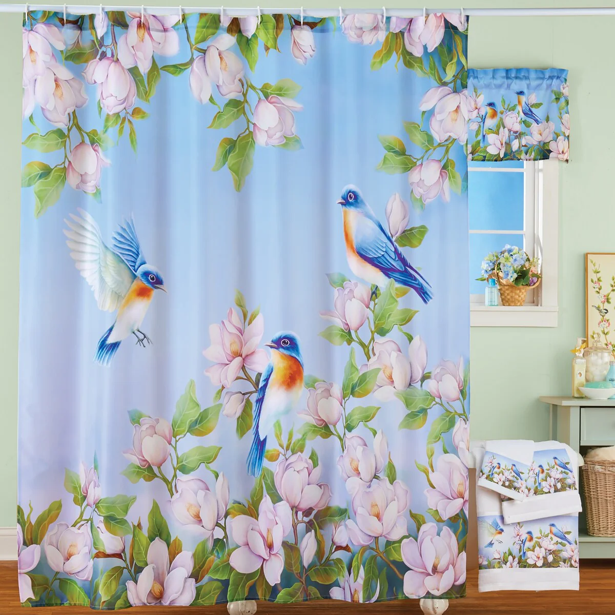 With a beautiful sky blue background, this lovely shower curtain features colorful bluebirds perched atop flowering magnolia branches. Hooks are included to make hanging easy. Machine wash. Plastic hooks and polyester curtain; imported. 70"L x 70"W. Hooks are 2 1/4"L x 1 1/2"W.