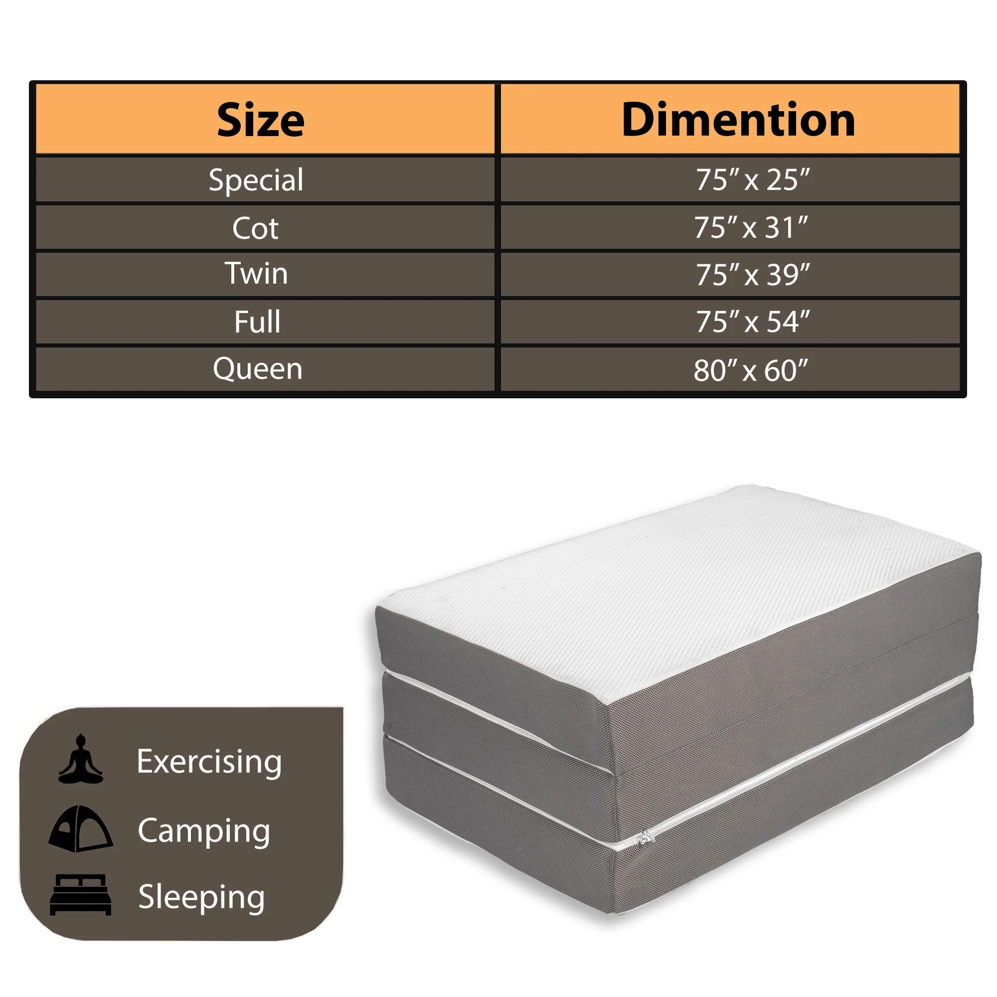 The  foam supports a  spongy soft memory foam for an ideal balance between supple body support and rich softness to send even light sleepers into dreamland without clunky springs or bed frames to creak or poke.  Perfect for an unexpected sleep over guest, camping and traveling. Wherever you go and whatever you do, use the Tri-Fold Mattress for the sleep you love.  For almost a decade, customers have favored the comfort and reliability of our products as a brand they can trust. Our design has you in mind, so you know your mattress is just right the first time, every time.Â