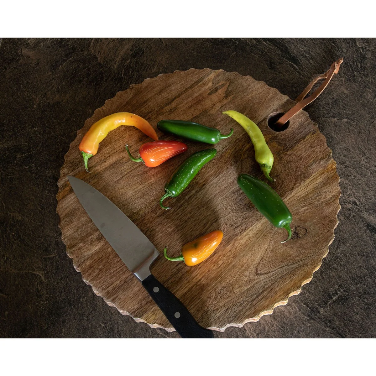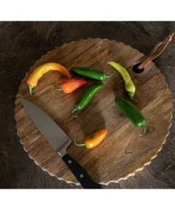 Part of Foreside’s hand-carved  kitchen collection crafted with eco-friendly mango wood, this cutting board is perfect for all of your preparing and serving needs. The natural mango wood grain allows this cutting board to sit seamlessly with your other kitchen accessories. The quality craftsmanship with which each piece is made will make you want to keep these out as a beautiful kitchen accent when not in use.Â
