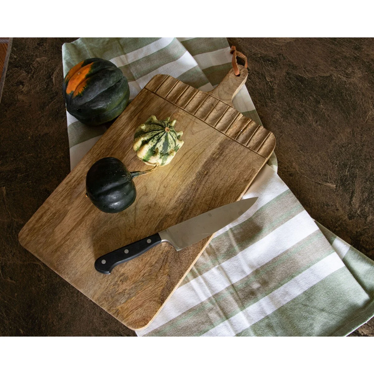 Part of Foreside’s hand-carved kitchen collection crafted with eco-friendly mango wood, this cutting board is perfect for all of your preparing and serving needs. The natural mango wood grain allows this cutting board to sit seamlessly with your other kitchen accessories. The quality craftsmanship with which each piece is made will make you want to keep these out as a beautiful kitchen accent when not in use. -Multi-functional and stylish kitchen board, can be used for preparing, cutting, and serving -The beautiful natural mango wood grain offers a clean, simple, and transitional kitchen accessory with an aesthetic that won’t go out of style. -Hand-carved ridges at top of board add a textural dimension to a classic cutting board shape, creating a transitional look for any kitchen space -Hand wash with warm, soapy water and set out to air dry. -The mango wood used to make this item is part of a sustainable effort. For every mango wood tree that is harvested, at least one is planted in its place. -19.5 x 10.5 x 0.75"H