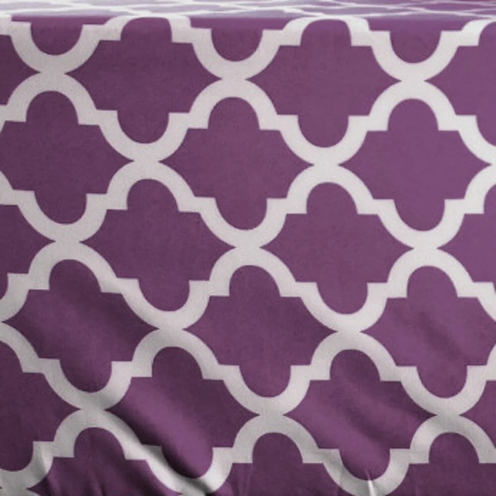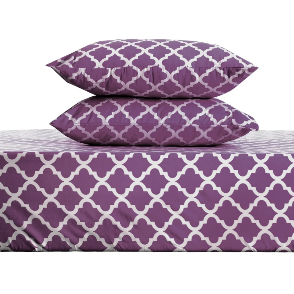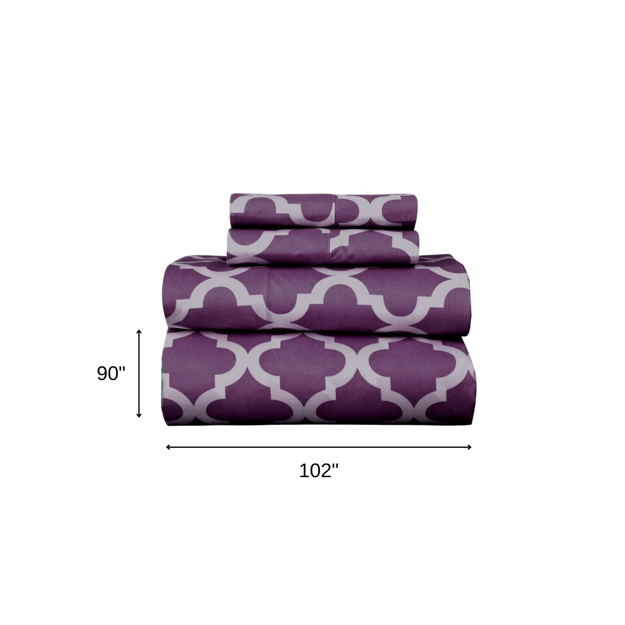 Four Piece Purple and White Quatrefoil Microfiber Queen Sheet Set