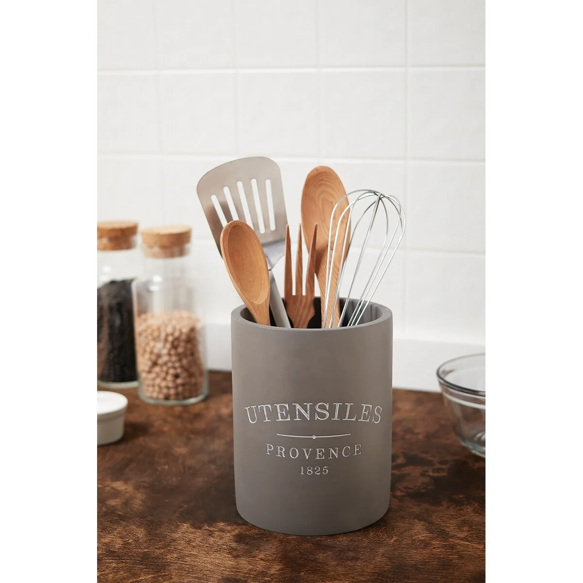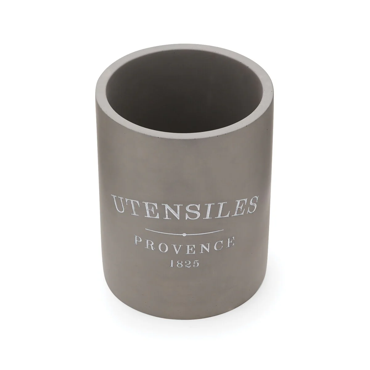 (1) Made of slate cement with attractive inscription on front(2)LARGE utensil holder that can be used for kitchen tools, office supplies, wine bottles and more! Use as an attractive display for wine bottles that also keeps them cold.(3) PROTECTIVE BOTTOM prevents any scratches on your desk or kitchen counter.(4) WON’T TIP OVER when reaching for utensils, pens, or other tools. Sturdy build that stands strong.(5) 5 x 5 x 7"No more frantically searching for utensils while cooking! Keep all your kitchen tools and gadgets in sight and at easy-reach with this Cement Utensil Holder. This stylish storage piece adds convenience and elegance to any kitchen, with its sleek slate grey appearance and attractive inscription. Perfect for any French-inspired décor. Made of sturdy cement stone, this durable utensil holder has a protective bottom to keep your countertop unmarked. Large enough to fit all your whisks, spatulas, tongs, and ladles and heavy enough to avoid tips and spills! It can even be used as a unique centerpiece for flowers. This is a perfect addition to any cook’s kitchen!