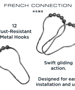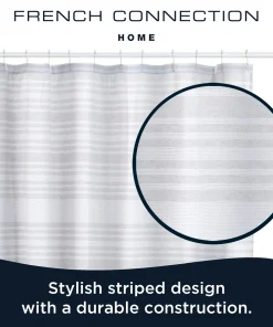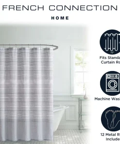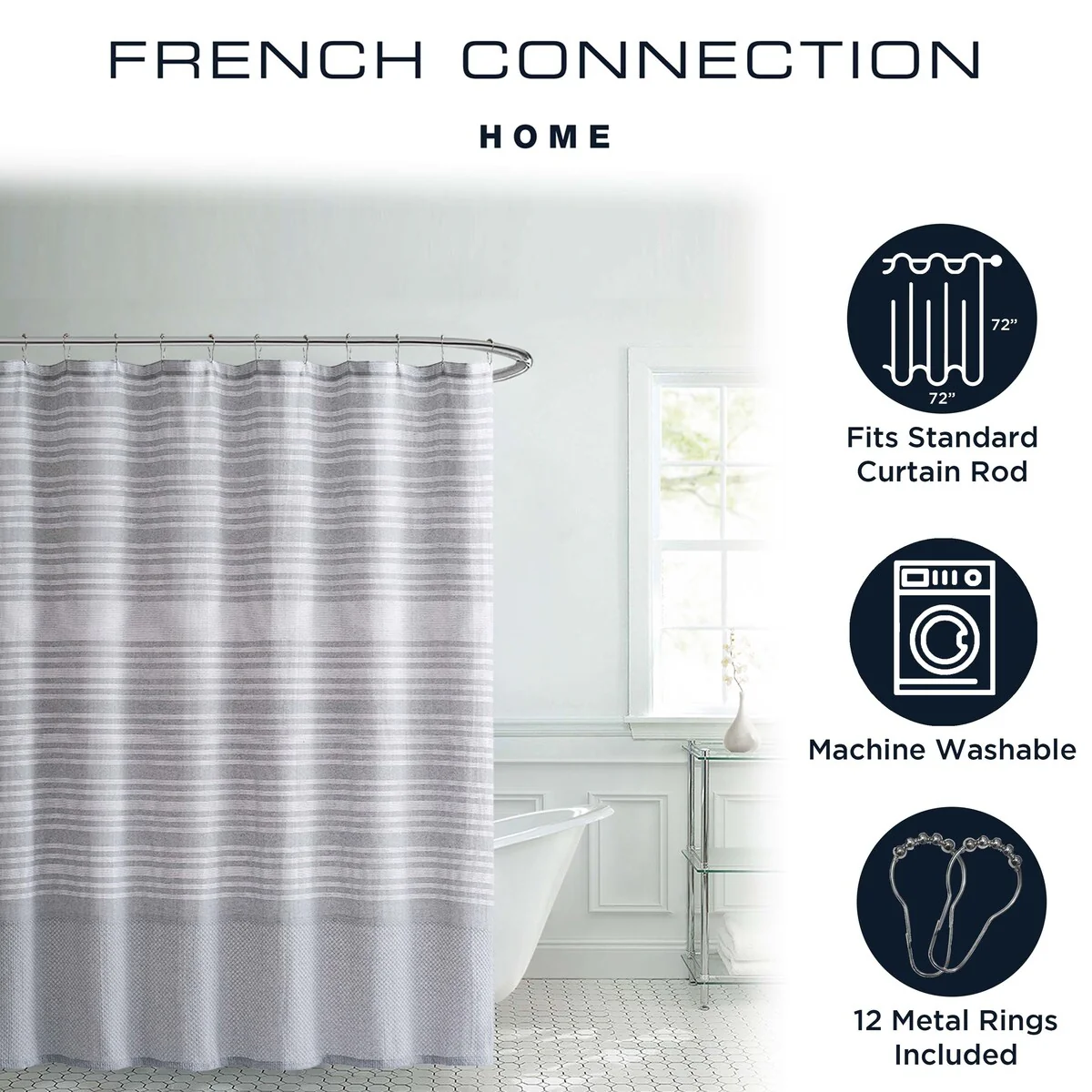 Dress up your bathroom décor with the Hastings Collection Shower Curtain by French Connection. This shower curtain consists of a soft blend of 60% cotton and 40% polyester. Available in 72 inch x 72 inch. Set includes (1) shower curtain and (12) metal roller hooks. Machine washable. Tumble dry low. Remove promptly. Low iron on reverse side if needed. A vinyl liner is recommended. Imported.