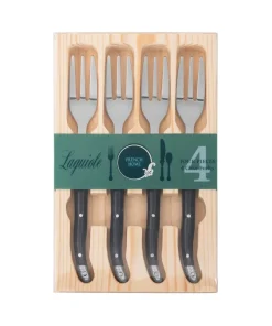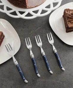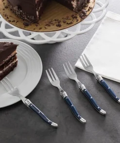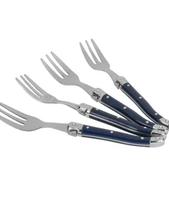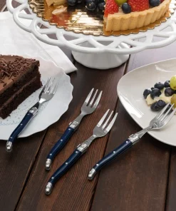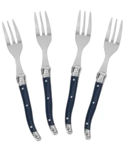 French Home’s set of Laguiole cocktail or dessert forks with sophisticated navy-blue handles are perfect for enjoying decadent chocolate cake, delicious pie, refreshing fruit tarts, or hors d’oeuvres like shrimp cocktail. Ideal for entertaining, these perfectly sized dessert forks are dishwasher safe making them as practical as they are elegant. The Laguiole design originated in France and is renowned for its three-rivet curved handle with a bee emblem on the bolster symbolizing Napoleon and the French monarchy. Presented in a wood tray, this set of four Laguiole cake forks makes an ideal gift for bakers, chefs, and anyone who loves to entertain.