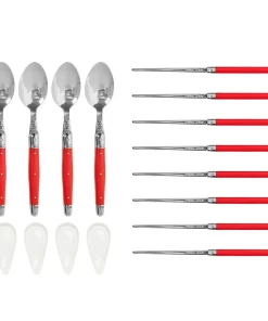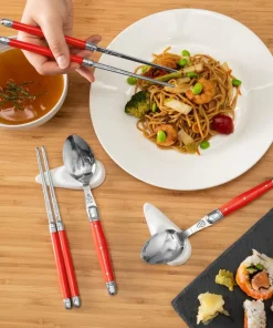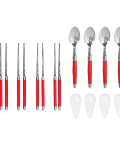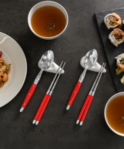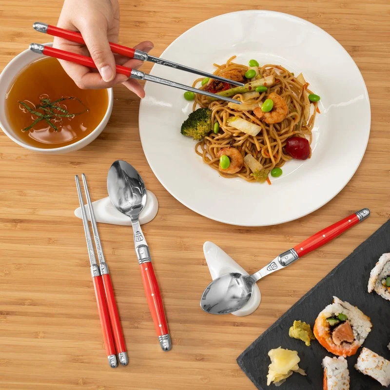 Enjoy fresh sushi, sweet Pad Thai, hot Pho, delicious ramen, and all your favorite Asian dishes with French Home’s iconic set of Laguiole spoons, chopsticks, and ceramic rests. This stunning set includes four pairs of chopsticks and spoons with vibrant red handles, along with convenient ceramic teardrop-shaped rests. Laguiole flatware is celebrated for its three-rivet handle and the iconic bee emblem on its bolster, symbolizing Napoleon and the French monarchy.Â