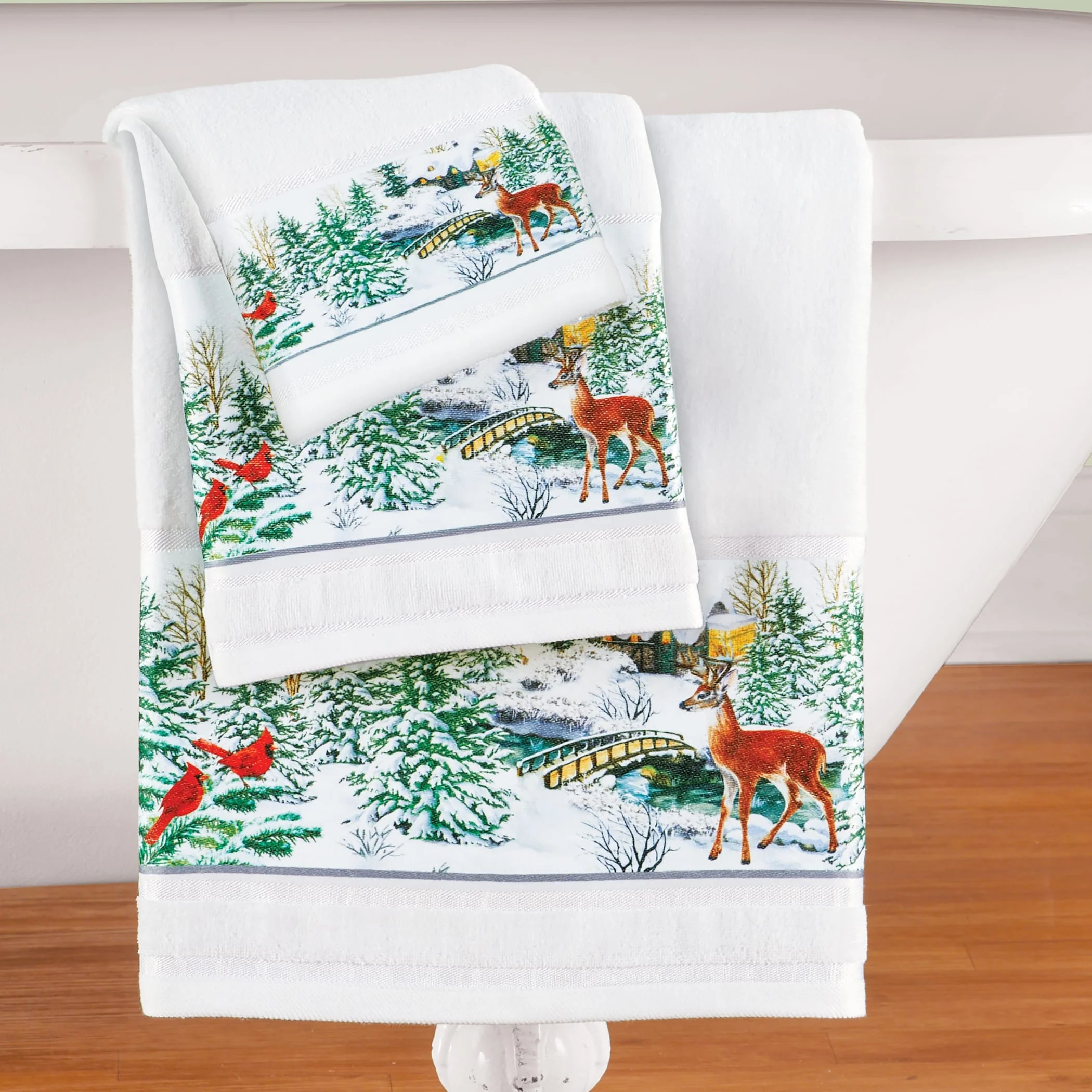 This 3-piece towel set features a snowy cabin in the woods with woodland animals in the foreground. The set includes a 48"L x 24"W bath towel, 25"L x 16"W hand towel, and a 12"Sq. washcloth. Machine wash. Cotton and polyester; imported.