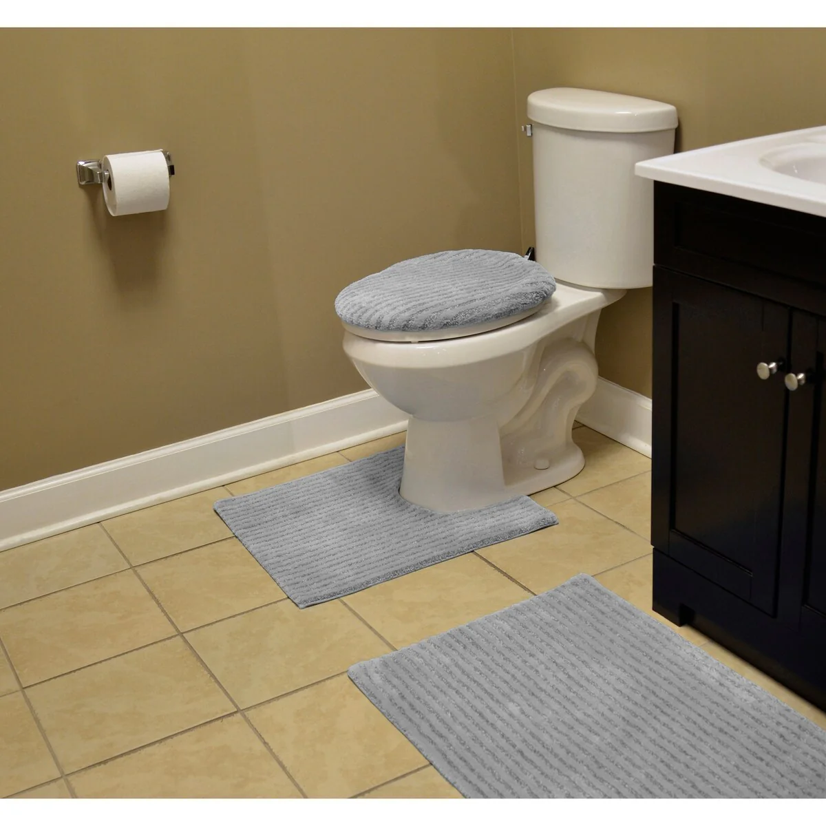 - 3 Piece Set: 21-in x 34-in Bath Rug, 21-in x 24-in Toilet Contour, and a 17-in x 14-in Toilet Lid Cover
