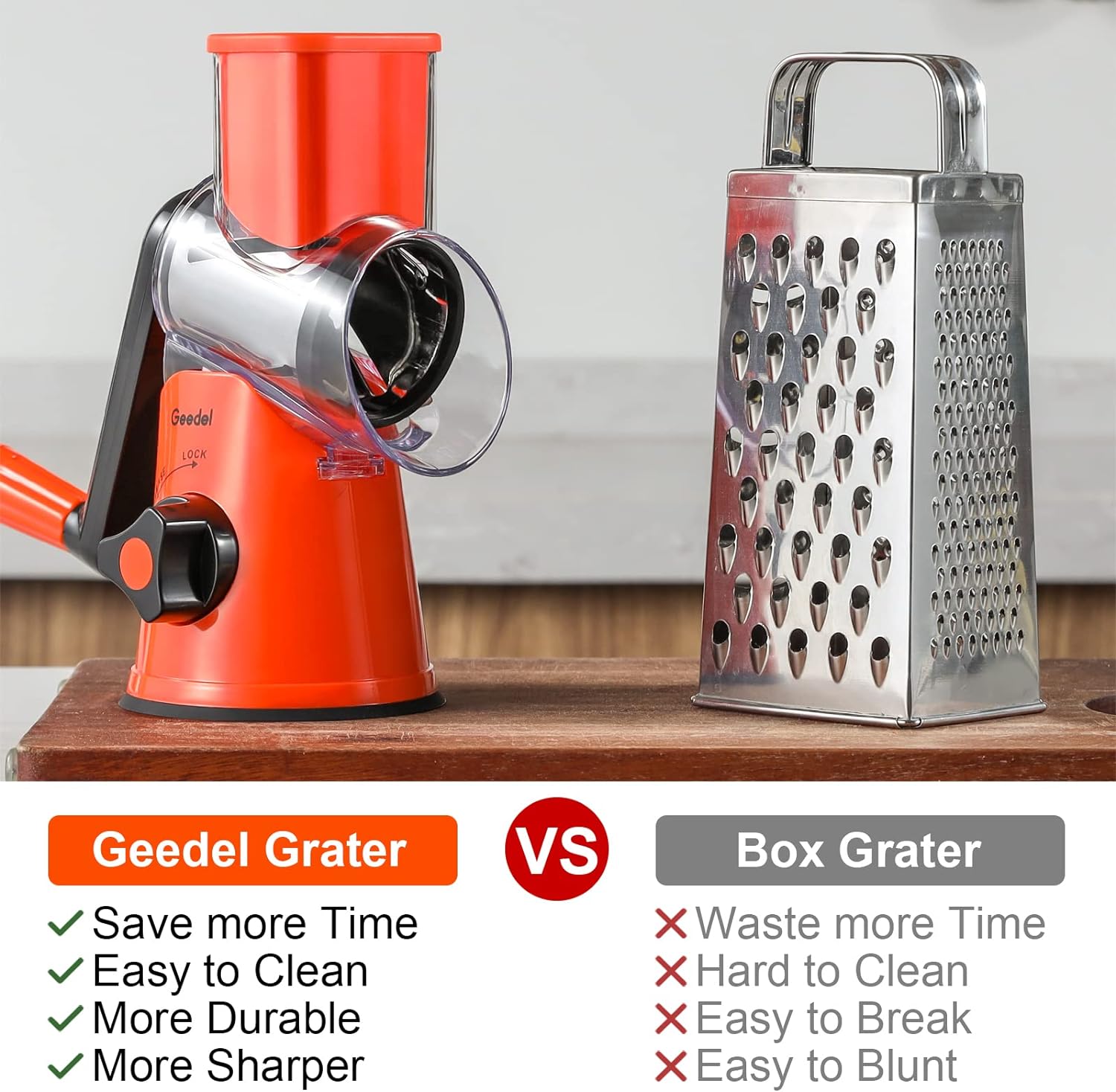 - Makes Everything Simple : Just forget your bagged cheese! Only turn the handle for several times and get fresh shredded cheese, cutting the food twelve time faster and saving more time. Go ahead for your favourite recipes with this cheese grater