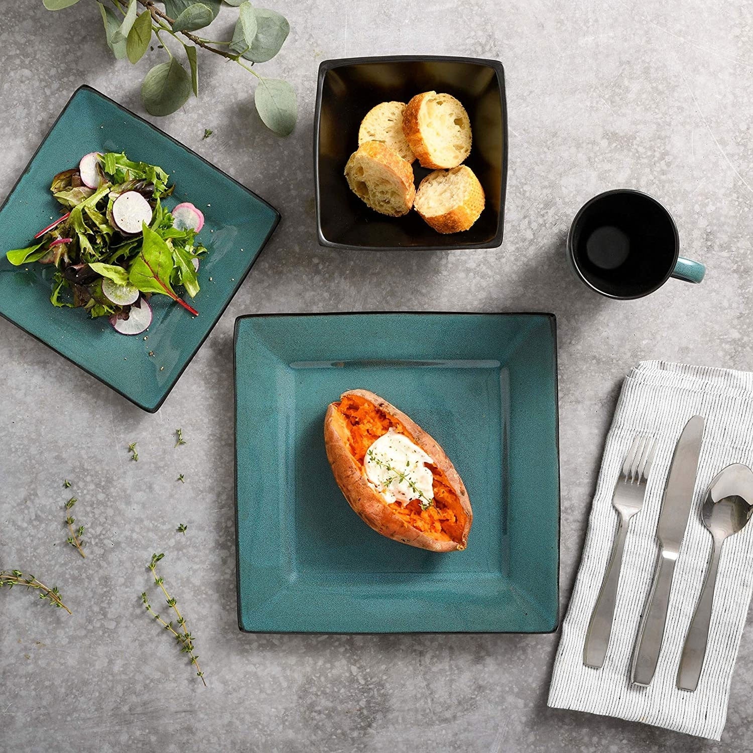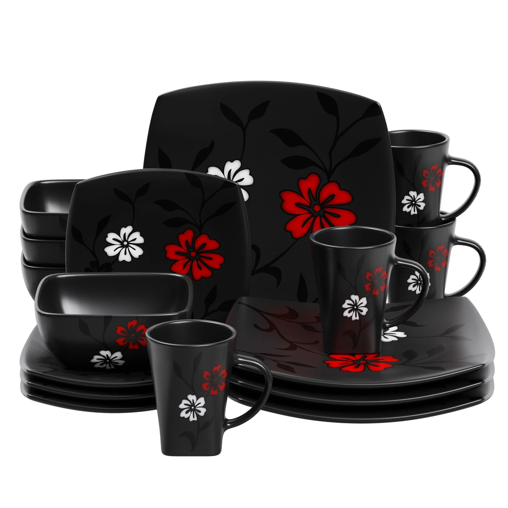- 16-piece dinner set includes 4 dinner plates, 4 dessert plates, 4 bowls, and 4 mugs; Package of 2 complete sets