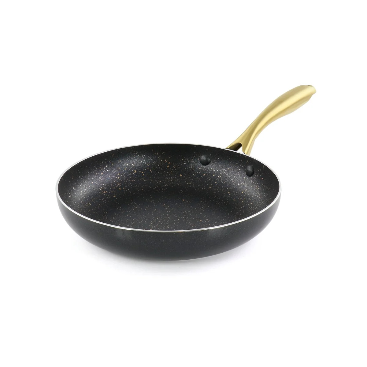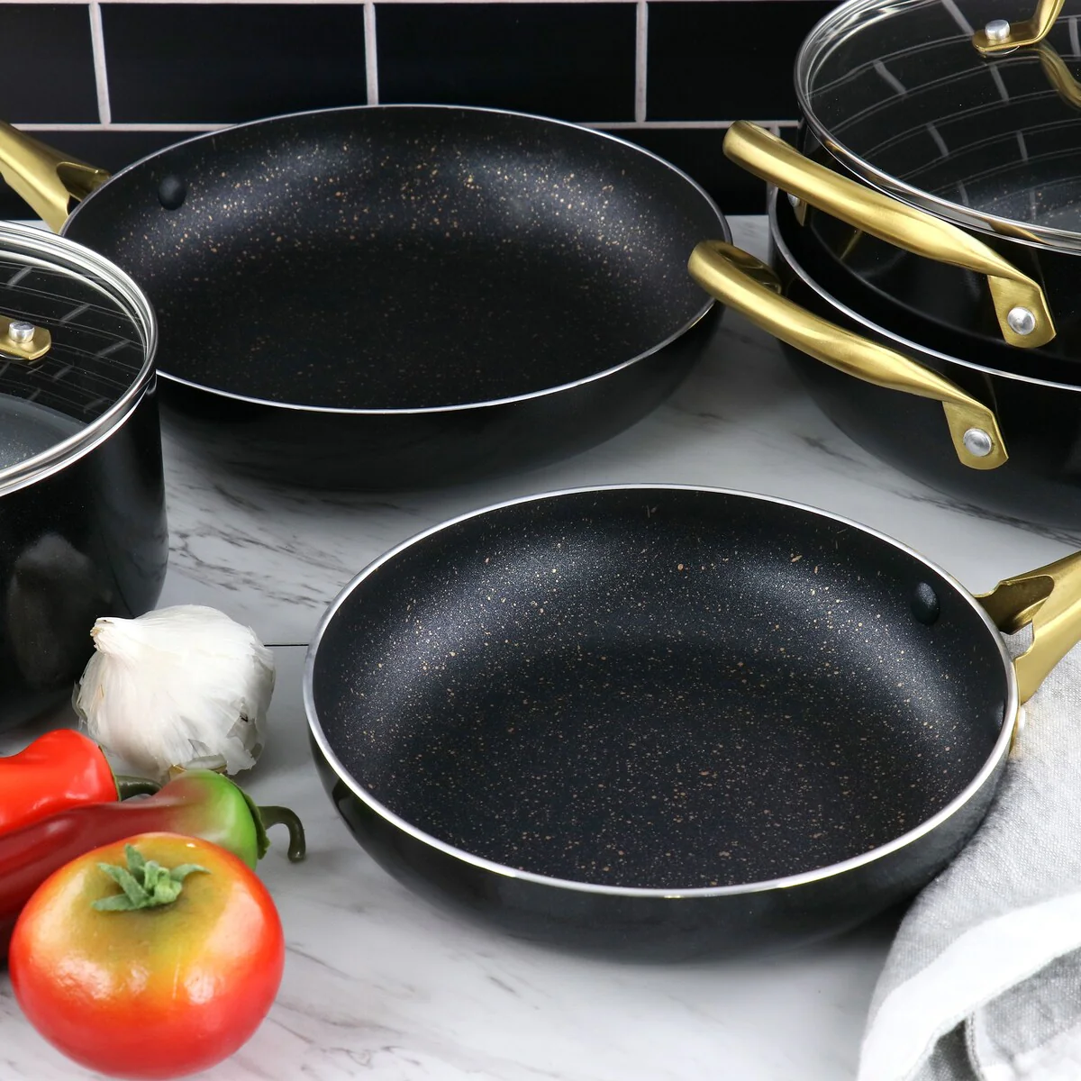 Have all your kitchen essentials ready with this Gibson Home Ellsworth 12 Piece Aluminum Nonstick Cookware Set. The set includes one dutch oven with lid, one saute pan with lid, one saucepan with lid, one 9.5" frying pan, one 8" frying pan, and four felt pan protectors. This set has everything you need to start cooking in your kitchen making it perfect for new home owners or even those looking to upgrade their cookware. The included felt protectors helps keep your cookware in prime condition by preventing scratching when the pans are stored away. Nonstick interior and ergonomic handles and knobs makes these super easy and convenient to use. Tempered glass lids allows you to safely watch your food while it’s cooking. All pans are dishwasher safe, but it’s highly recommended to hand wash as extensive use of detergents may cause surfaces to dull.Set: 12 Piece CookwareMaterial: AluminumFinish: NonstickShape: RoundColor: Black and GoldDishwasher Safe, Hand Wash Highly RecommendedTempered Glass LidErgonomic Handles and KnobsNonstick InteriorCompatible With Gas, Electric, Vitro Ceramic, and Induction Cook TopsSet Includes:One Dutch Oven With LidOne Saute Pan With LidOne Saucepan With LidOne 9.5" Frying PanOne 8" Frying PanFour Felt Pan ProtectorsPer Item Measurements:Dutch Oven- 13.25" length, 9.75" diameter, 7.5" height, 5 qt capacity, 3.3 lbs weightSaute Pan- 20.5" length, 10.5" diameter, 6.25" height, 3.5 qt capacity, 3.35 lbs weightSaucepan- 14.5" length, 7.25" diameter, 7" height, 2 qt capacity, 2.15 lbs weightMedium Frying Pan- 17.75" length, 9.5" diameter, 2" height, 1.45 lbs weightSmall Frying Pan- 15.5" length, 8" diameter, 1.75" height, 1.1 lbs weight