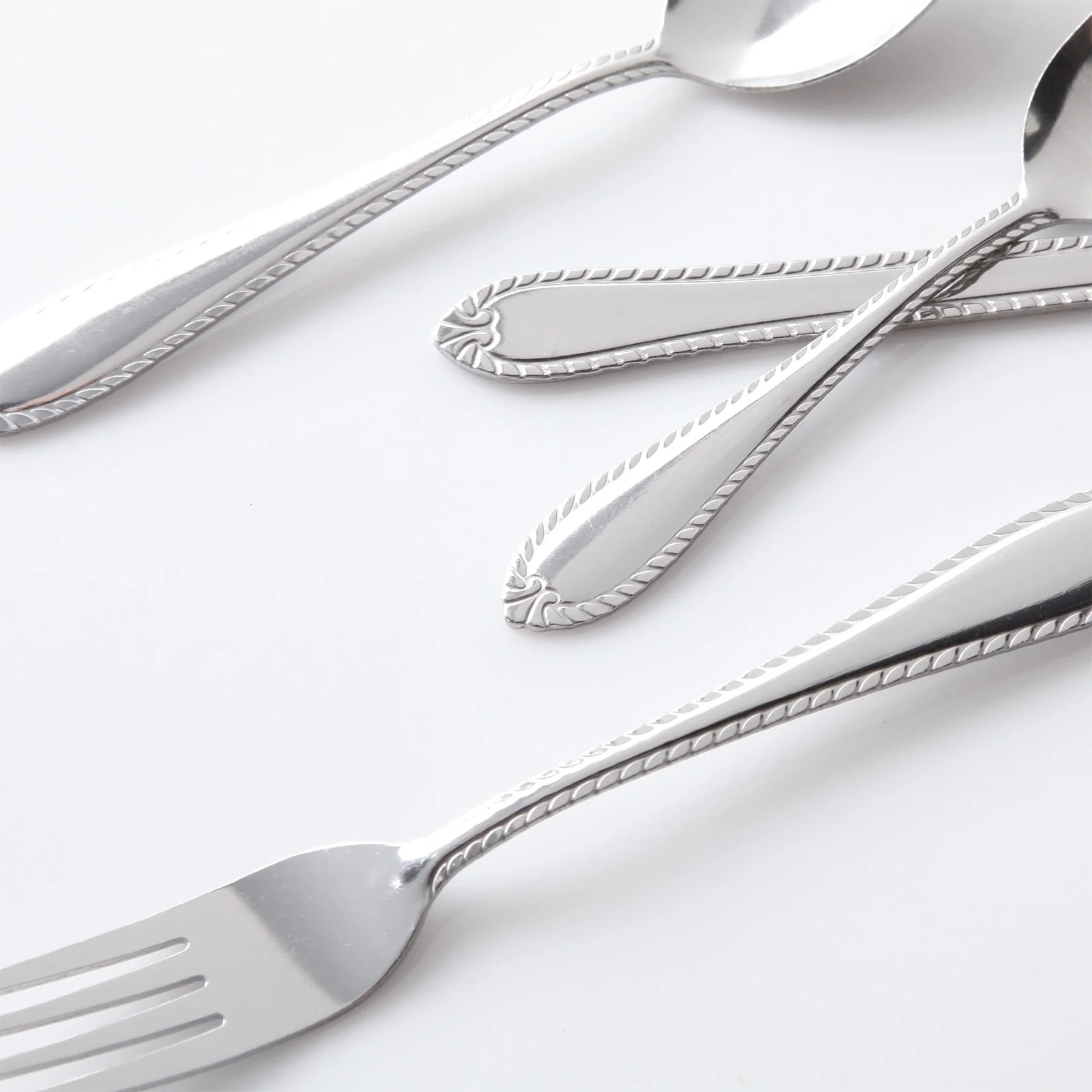 The perfect finishing touch to an already enticing, well arranged dining surface, this eye-catching 24-piece flatware set offers dining for six in classic style. This stainless steel set has rounded handles with fringed edges that are as pleasing to the touch as they are to the eye.