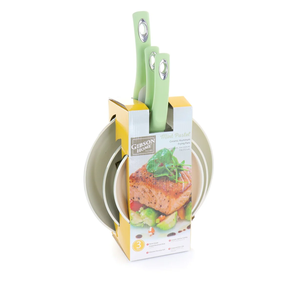 Step up your cooking game with the essential Gibson Home Pastel 3 Piece Aluminum Nonstick Ceramic Frying Pan Set in Mint. The cookware set allows for multiple cooking jobs as each size can hold the appropriate portion for the perfect meal. The heavy gauge aluminum base is built to handle gas, electric, halogen, and induction heat. Cut down on fats and oils with the nonstick ceramic coating; allowing for much healthier dishes. Create outstanding omelettes, Cajun spiced chicken, fantastic fried rice or many other plates for guests to enjoy.