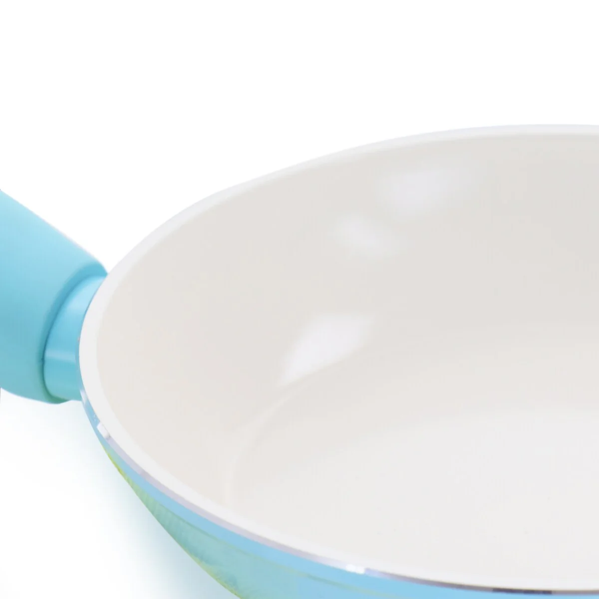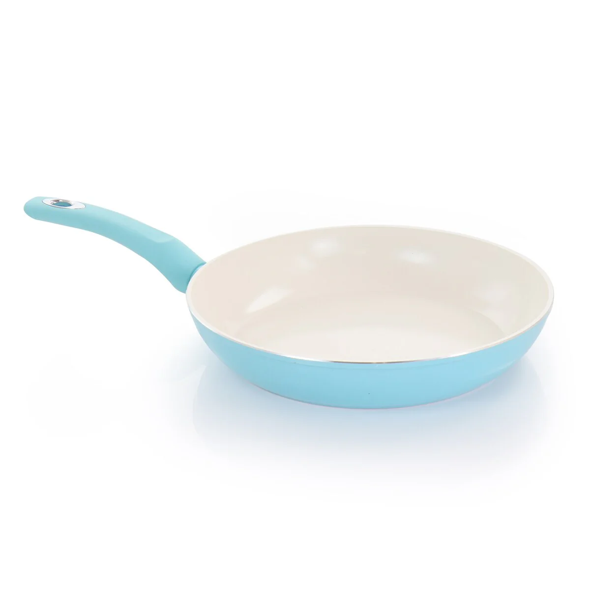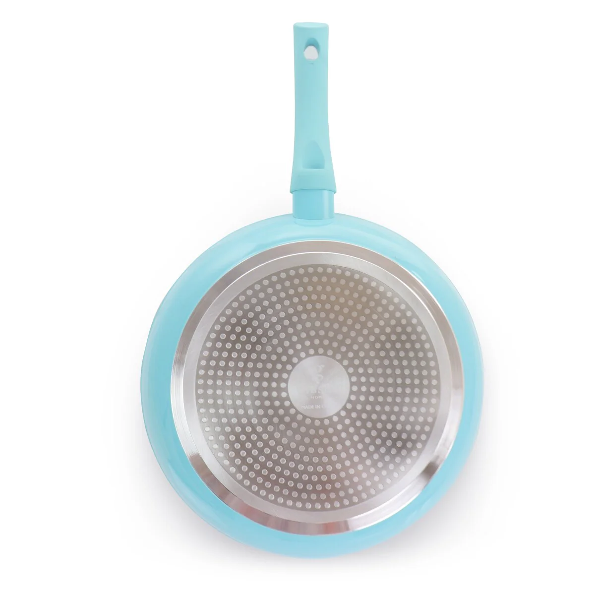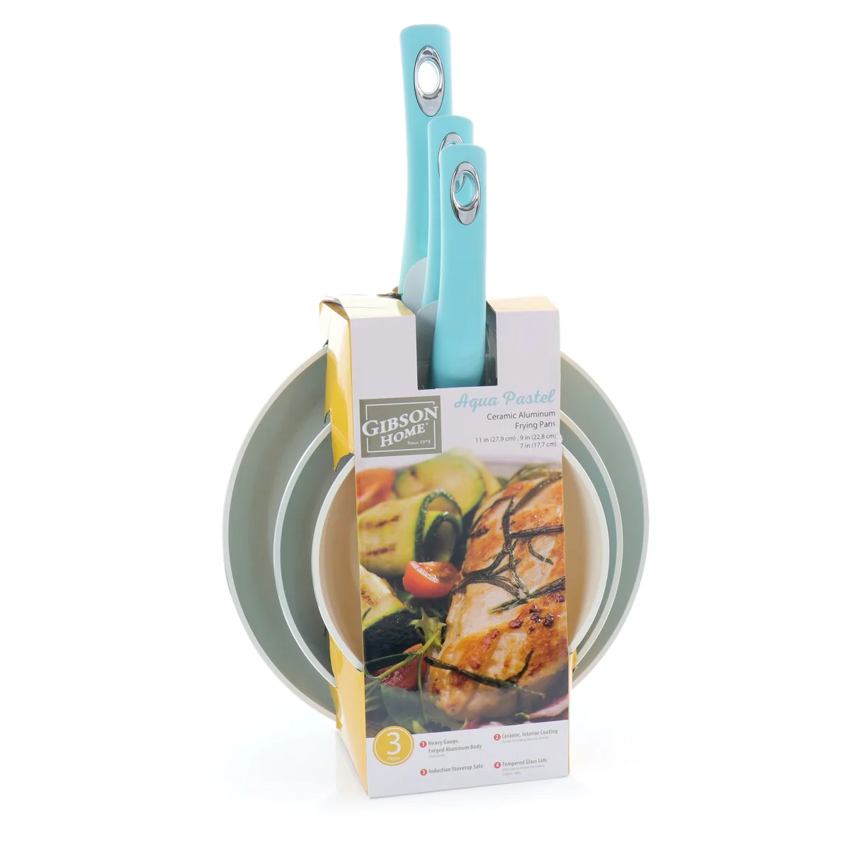 Step up your cooking game with the essential Gibson Home Pastel 3 Piece Aluminum Nonstick Ceramic Frying Pan Set in Aqua. The cookware set allows for multiple cooking jobs as each size can hold the appropriate portion for the perfect meal. The heavy gauge aluminum base is built to handle gas, electric, halogen, and induction heat. Cut down on fats and oils with the nonstick ceramic coating; allowing for much healthier dishes. Create outstanding omelettes, Cajun spiced chicken, fantastic fried rice or many other plates for guests to enjoy.