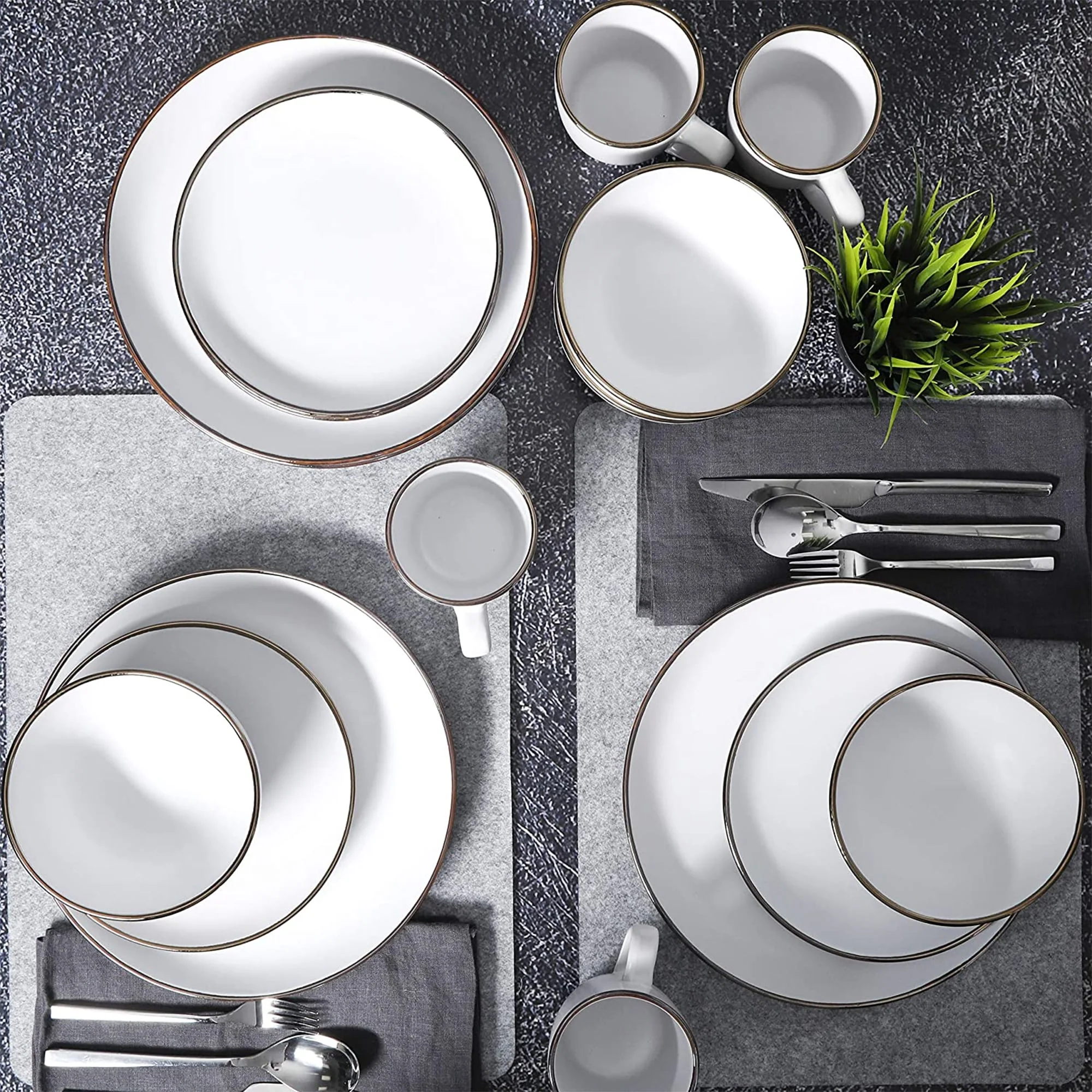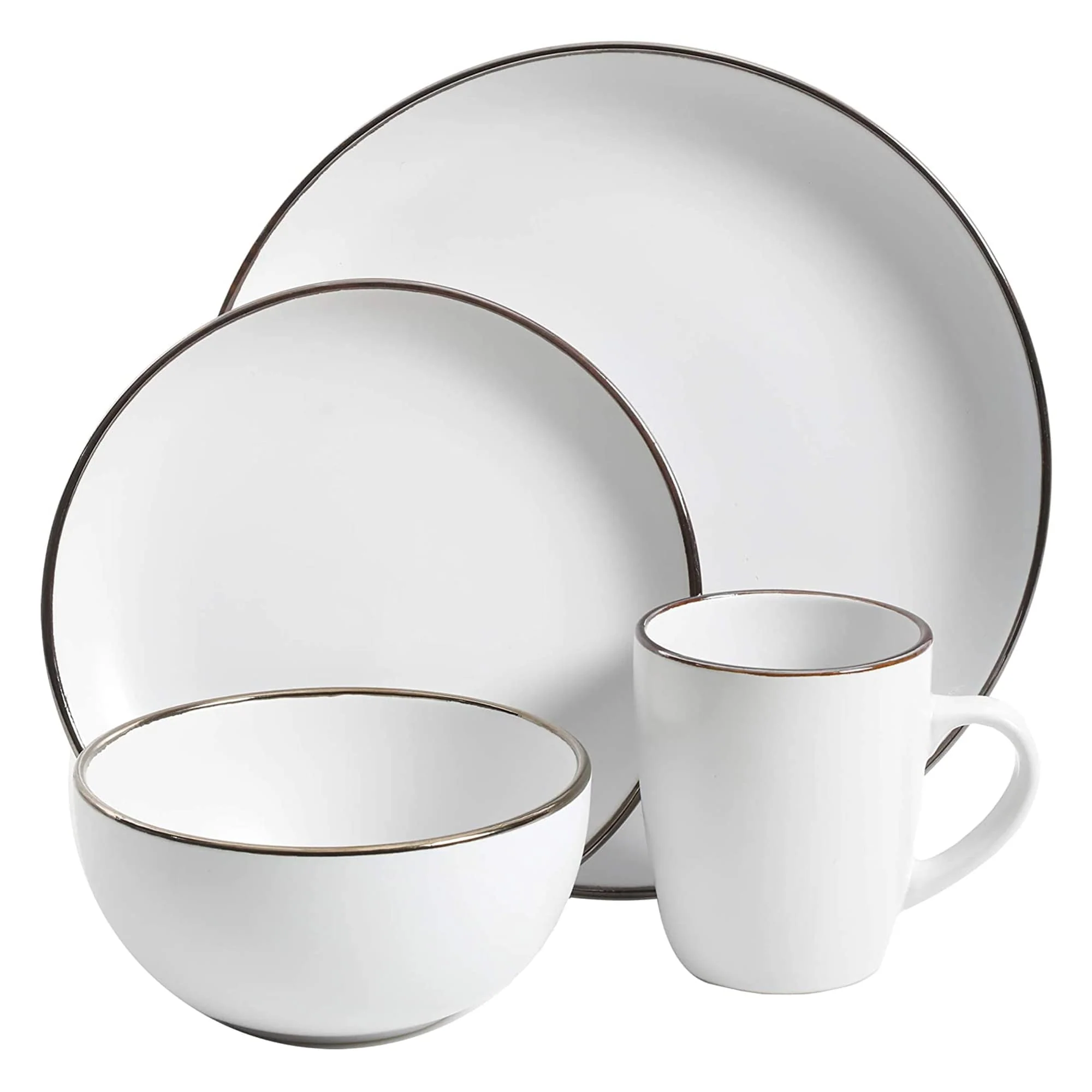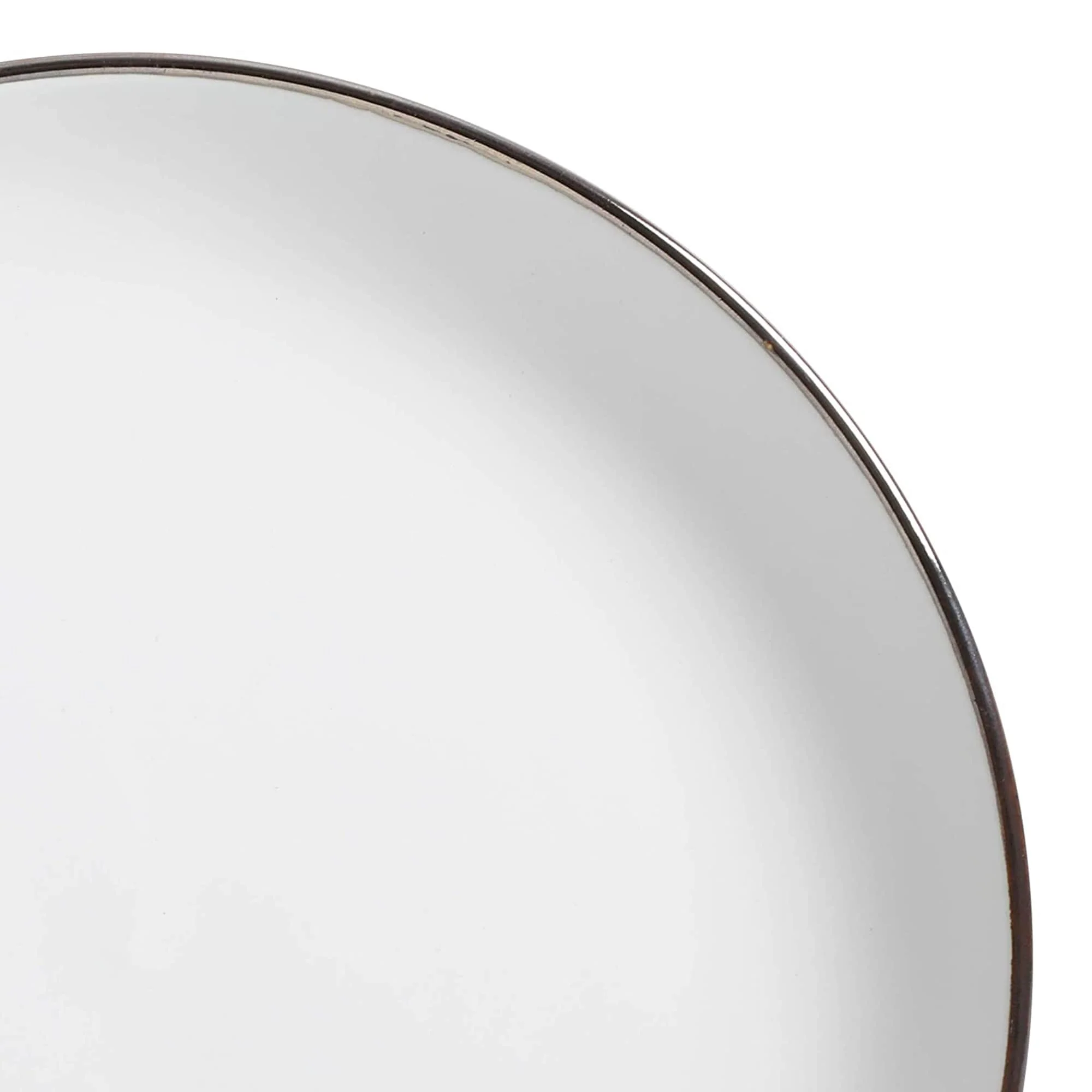 - Faux metallic trim along the rims brings a touch of modern simplicity to the dinnerware for an elevated look