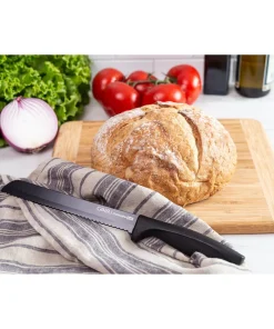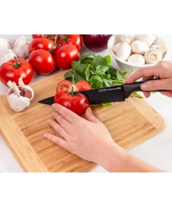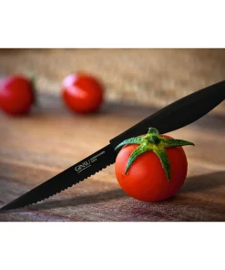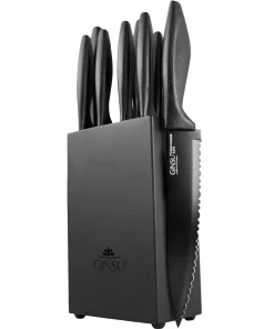 The Daku series is elegantly designed for long-lasting no-maintenance use. Never need sharpening! These Ginsu Daku series knives utilize Ginsu’s double serration design to provide an ultra-sharp blade to reliably cut through anything. Black ceramic coated blades won’t chip or fade and are 100% dishwasher safe. This set includes: 8" Chef Knife, 8" Bread Knife, 7" Santoku, 4.5" Utility, 3.5" Paring, (4) 4.5" Steak Knives, Black Wood Block.