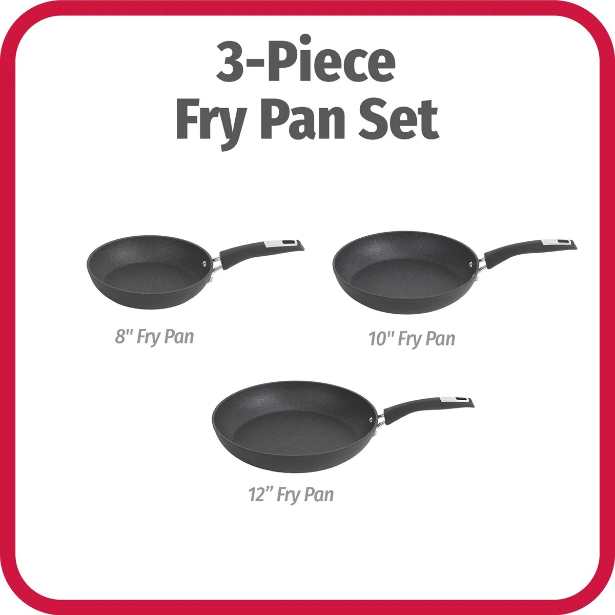 - 3-PIECE FRY PAN SET: Includes 8-in. fry pan, 10-in. fry pan, and 12-in. fry pan all with generous vessel depths so you’ll always have the right pan for your needs