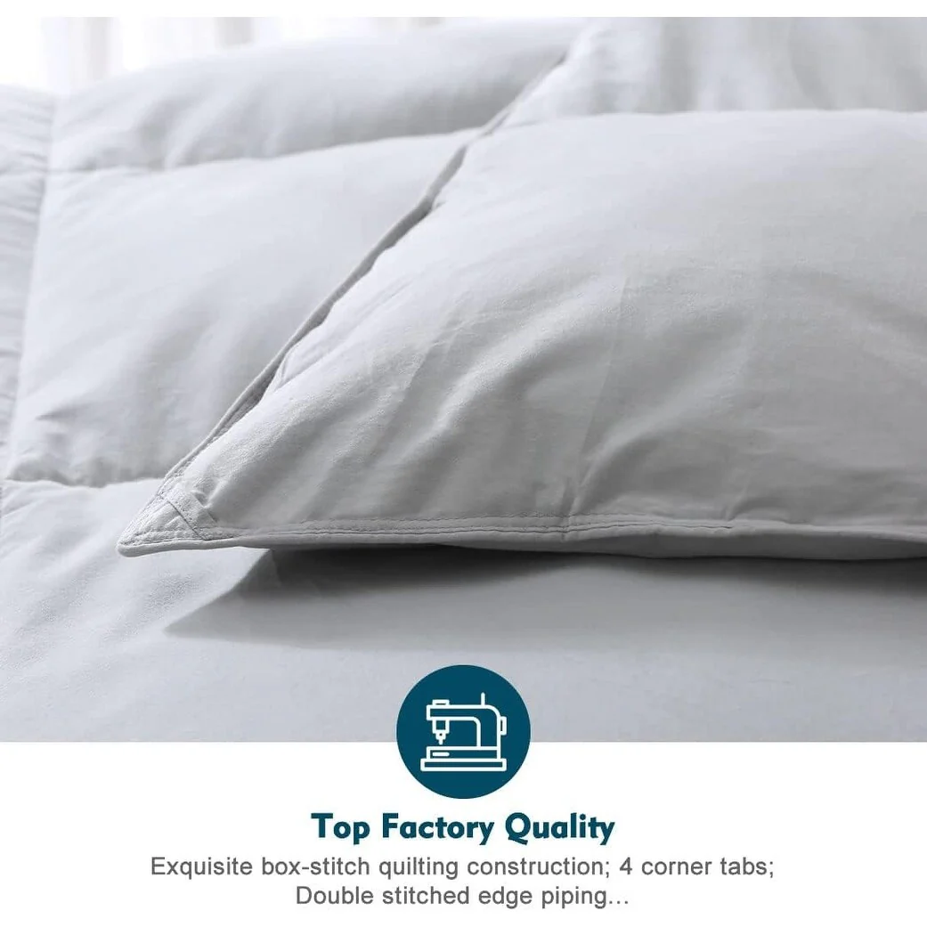 - HIGH QUALITY COMFORTER: Double stitched edge piping ensures our goose feather down comforter durable.Rigorous process control makes you zero concern of filling leakage or loose thread.4 size available(Twin, Queen, King and California King). 2 color available(White,Grey).