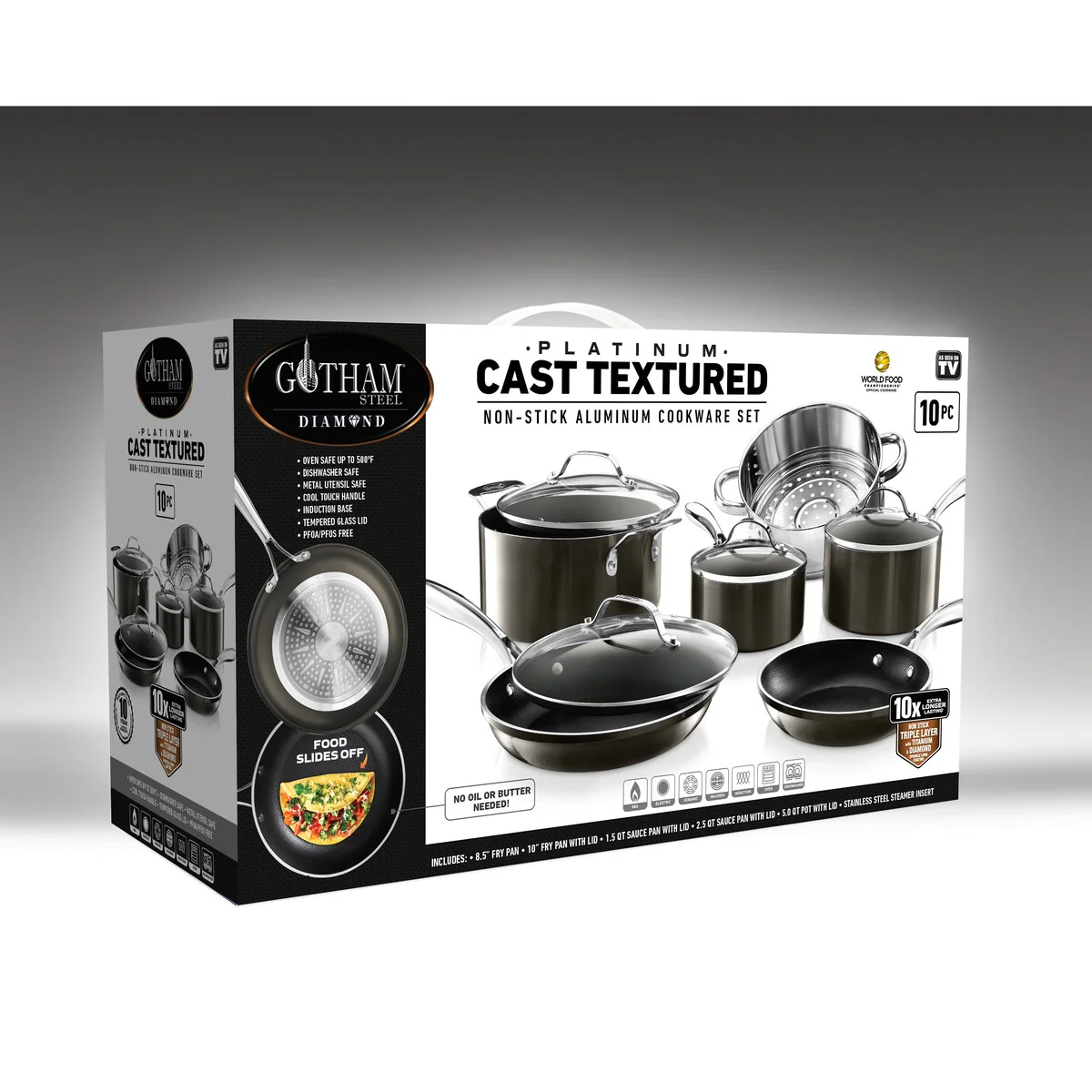 Gotham Steel Platinum Cast Textured 10pc Cookware set is the perfect set for every kitchen. The cast textured interior gets you that perfect sear while making it easy for cleanup giving you the best of both worlds!