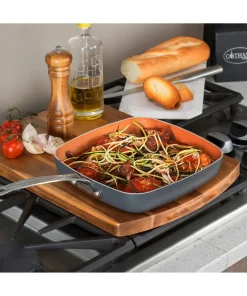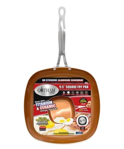 The pan that can fit it allWe decided to make the traditional round pan more practical by taking it & changing it’s shape to a more squared design. Why Square? Because square fits more and takes up less room in your cabinet. If you can only have one pan- the Gotham Steel Shallow square pan should be the one!PTFE/ PFOS/ PFOA FreeMade of Patented Ticerama (Titanium Ceramic)Induction compatible baseOven safe up to 500 degreesDishwasher SafeFlame Proof9.5" frying pan with lid, 11" frying pan with lid, 12.5" frying pan with lid.Non- Stick so no oil or butter is neededNon- scratchCoating will never peelMetal utensil safeEven heat distrubution