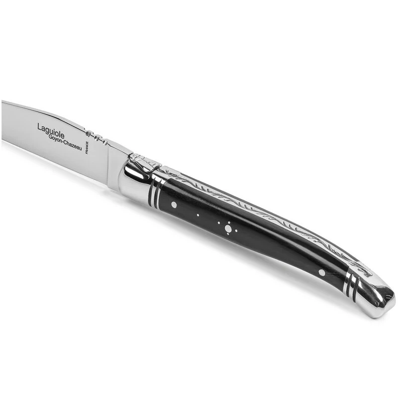 Expertly handcrafted in Thiers, France, the renowned birthplace of master knife making, Goyon-Chazeau’s Laguiole Ebony steak knives, feature a classic and elegant black wood handle, reflecting a heritage of exceptional craftsmanship.