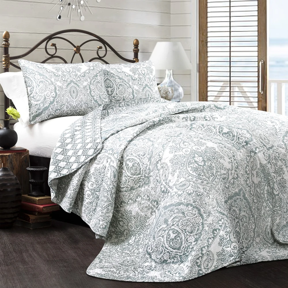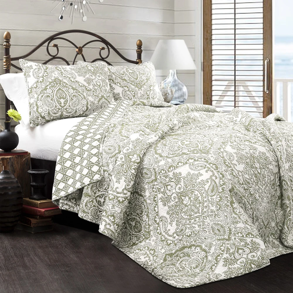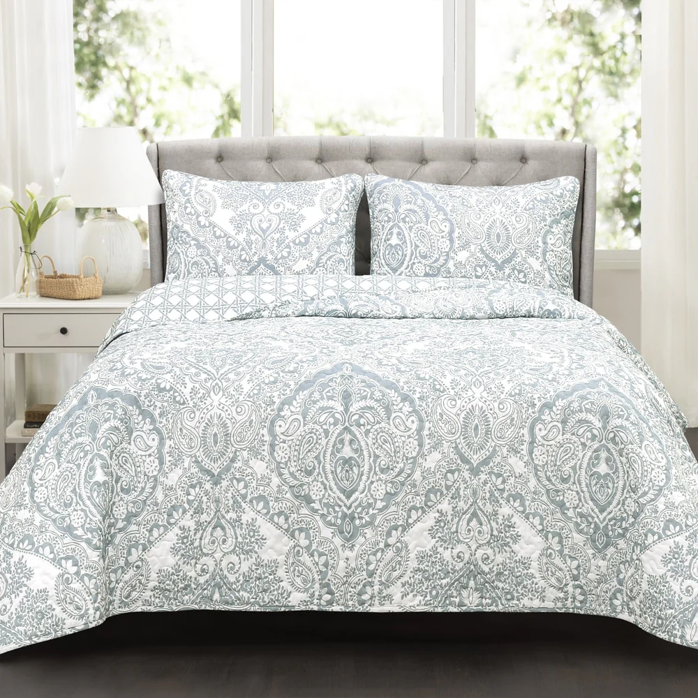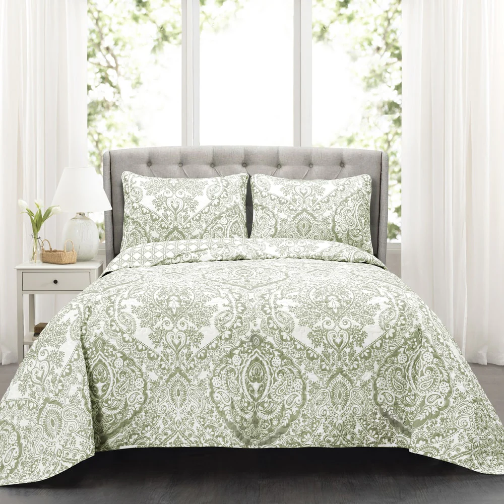 Add a touch of charm to your bedroom with the Winchester Damask 3-piece Quilt Set from Gracewood Hollow. This quilt set features a lovely damask pattern that can be reversed to reveal a contemporary geometric pattern, making it easy to switch up your decor. Made entirely of woven cotton, the set includes one quilt and two coordinating shams, and is available in your choice of green, blue, or black. In addition, the set is machine washable, making it easy to keep clean and fresh.