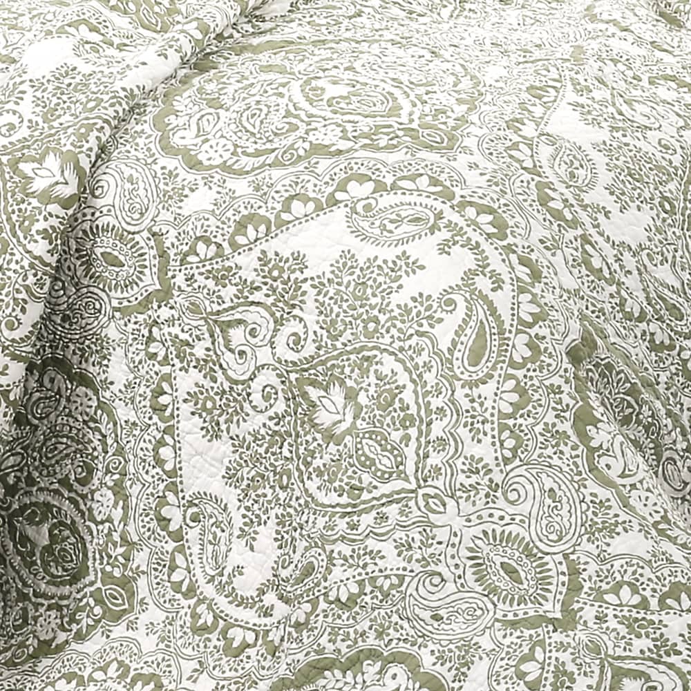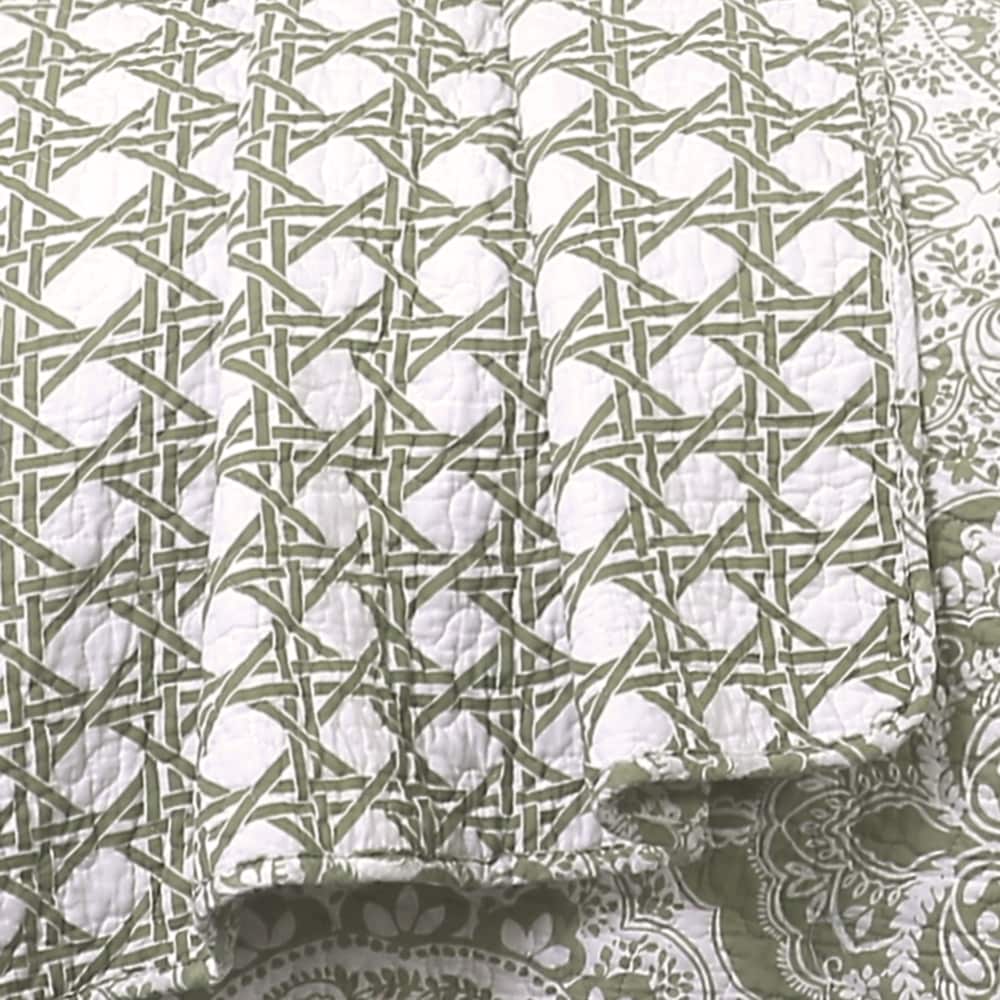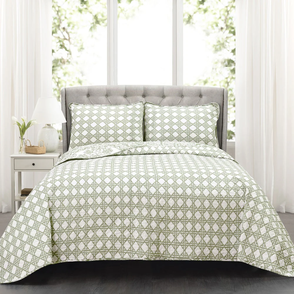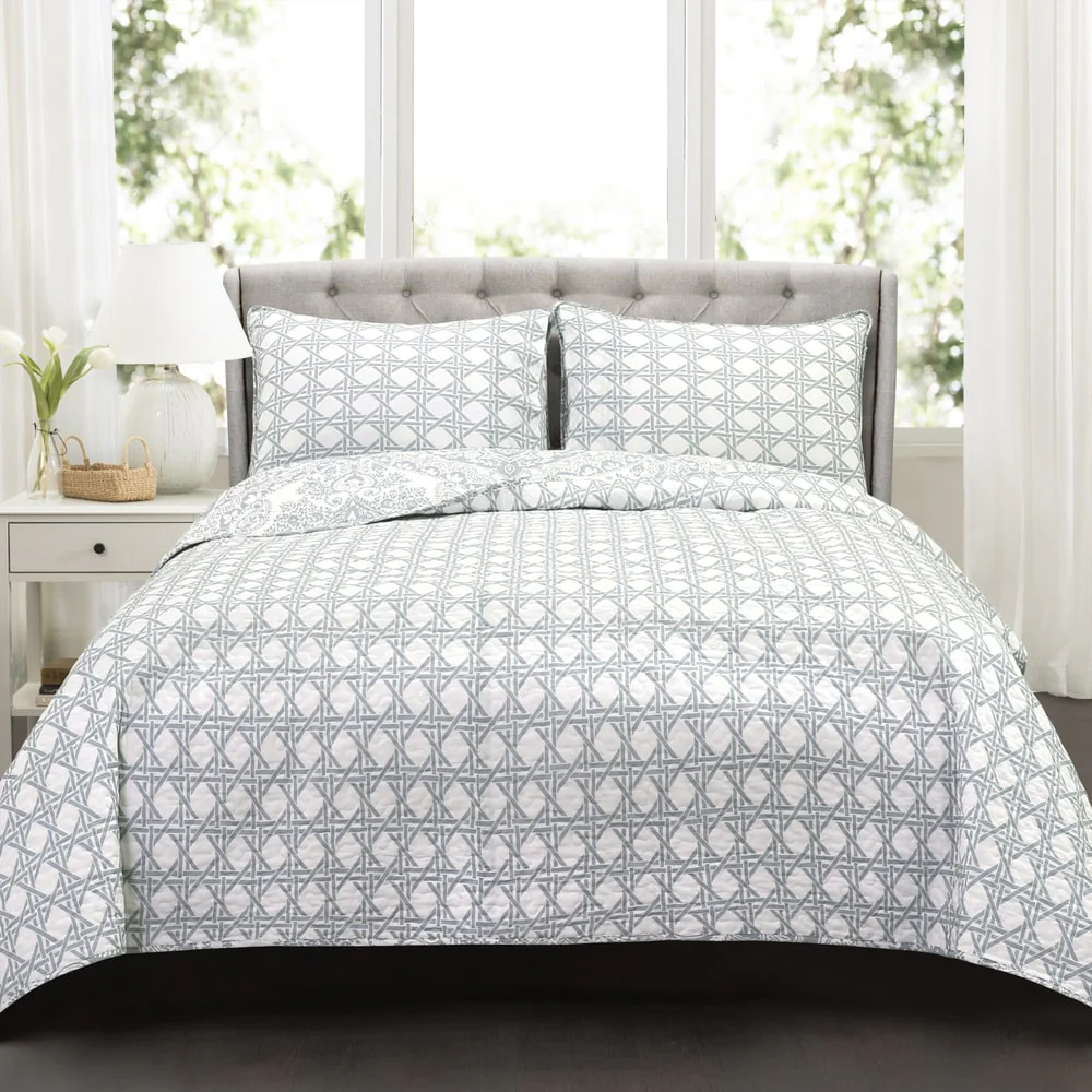 Add a touch of charm to your bedroom with the Winchester Damask 3-piece Quilt Set from Gracewood Hollow. This quilt set features a lovely damask pattern that can be reversed to reveal a contemporary geometric pattern, making it easy to switch up your decor. Made entirely of woven cotton, the set includes one quilt and two coordinating shams, and is available in your choice of green, blue, or black. In addition, the set is machine washable, making it easy to keep clean and fresh.