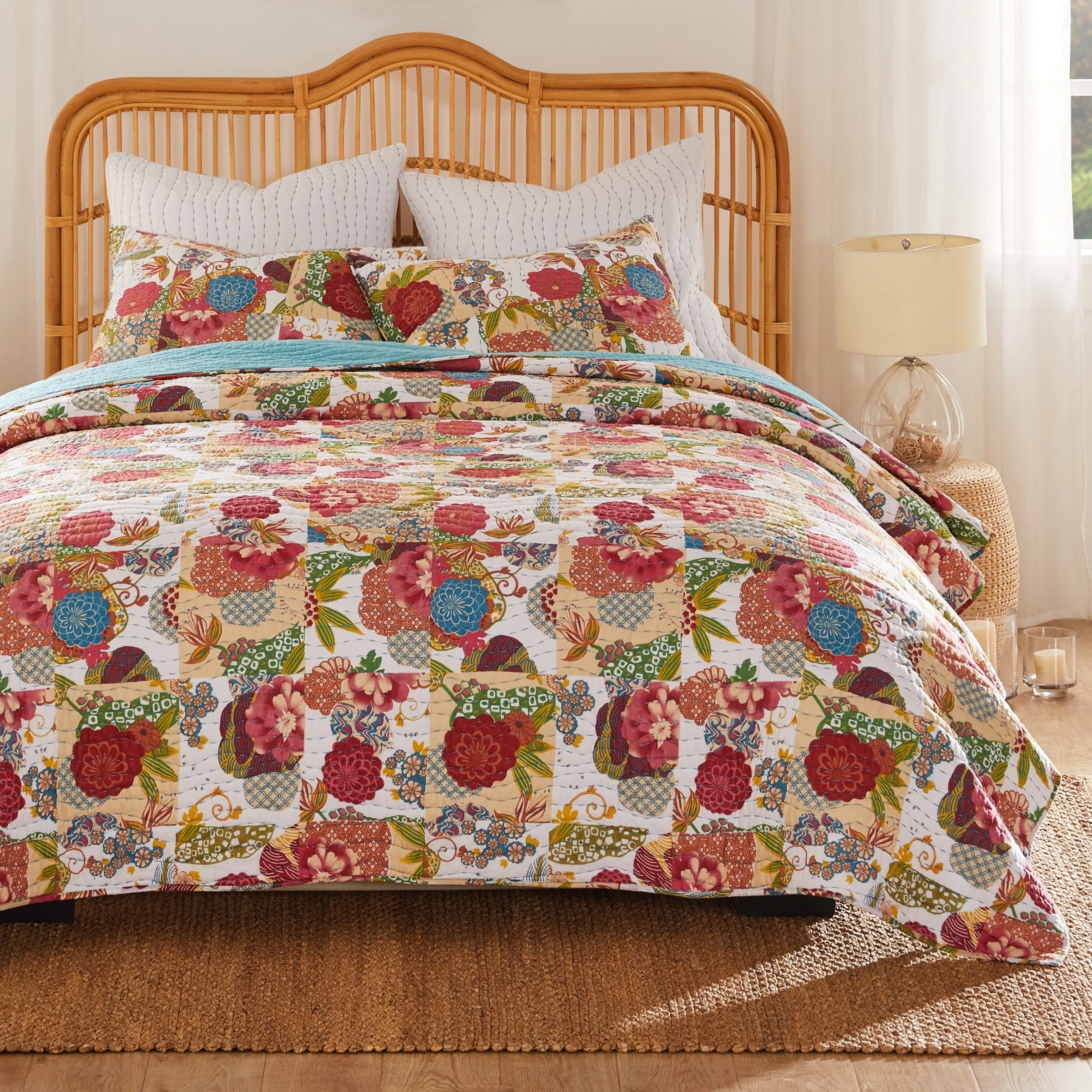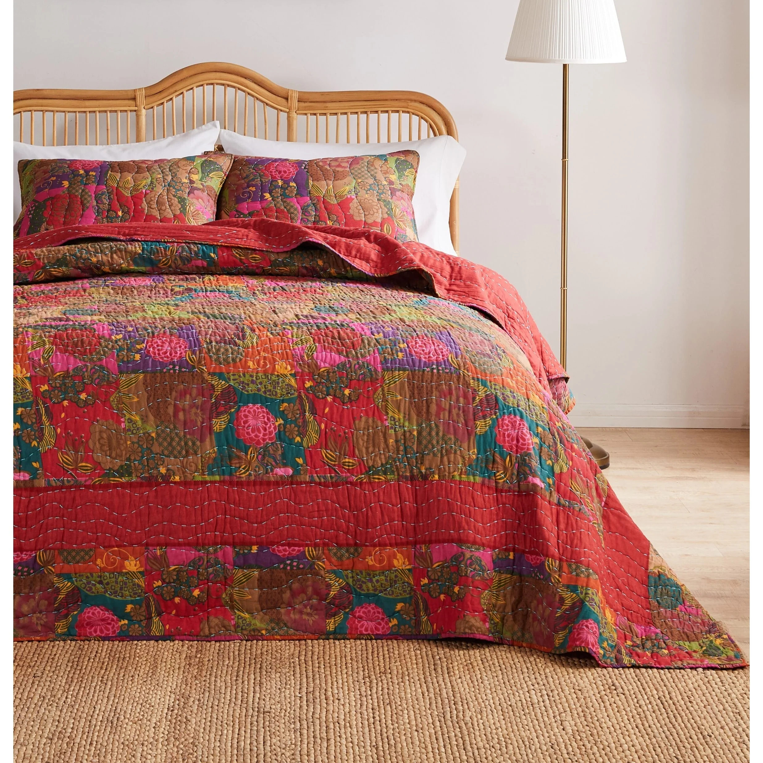 Add a pop of color to your room with this stunning Greenland Home Fashions Jewel Quilt Set. Made from 100% cotton, this quilt set is kantha machine quilted with thick bright yarn for added durability. The fashionable pattern and eye-popping colors create a bold and contemporary style that will liven up any bedroom or dorm room. Plus, caring for this bedding set is fast and easy as it is machine washable. Available in Quilt and Jumbo oversized floor-length Bedspread set sizes (coverage will vary with size and bed height – see dimensions below).