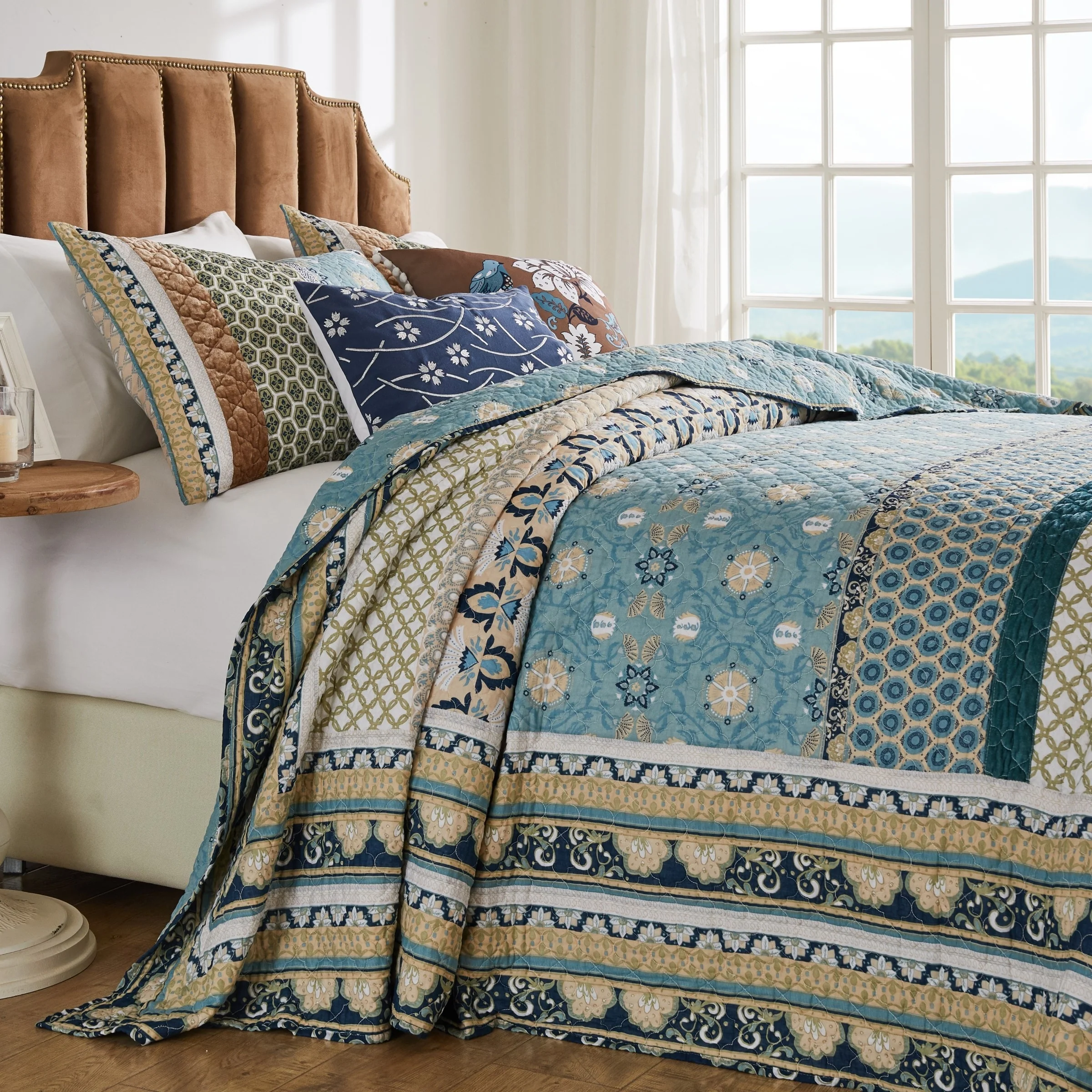 Bring a breath of fresh air to your bedroom with the Greenland Home Fashions Thalia 3-piece Bedspread Set. Made of a pieced 100-percent cotton shell with velvet embellishments, this set is durable, soft and comfortable. Rows of vivid medallions, stylized florals and geometric prints create distinctive bohemian styling. The Thalia floor-length bedspread set features mitered borders and multi-fabric construction embellished with velvet bands. Â Reverses to a coordinating updated floral print on a Caribbean blue ground. Designed to be floor-length on most beds (your bed height may vary).Â
