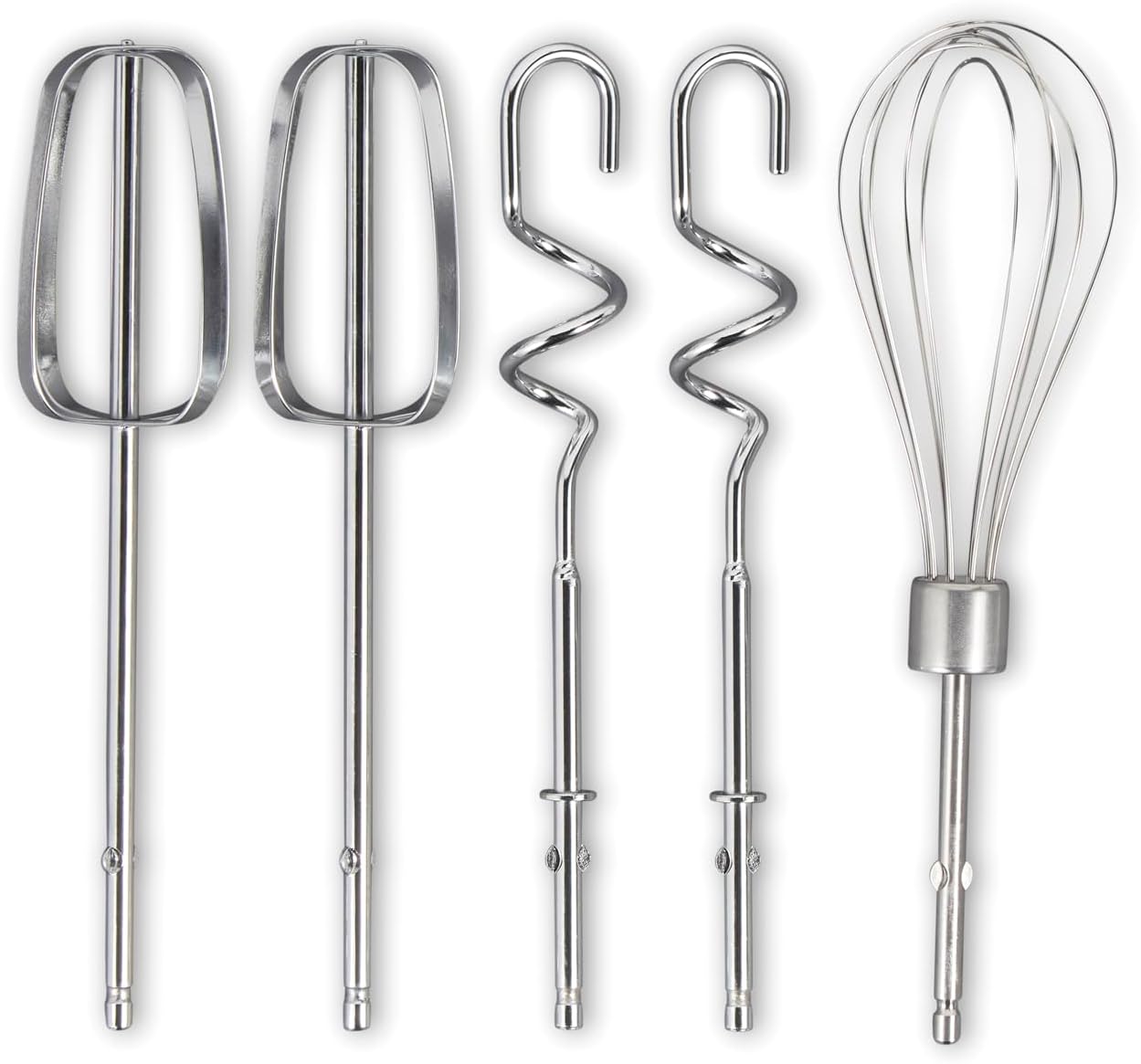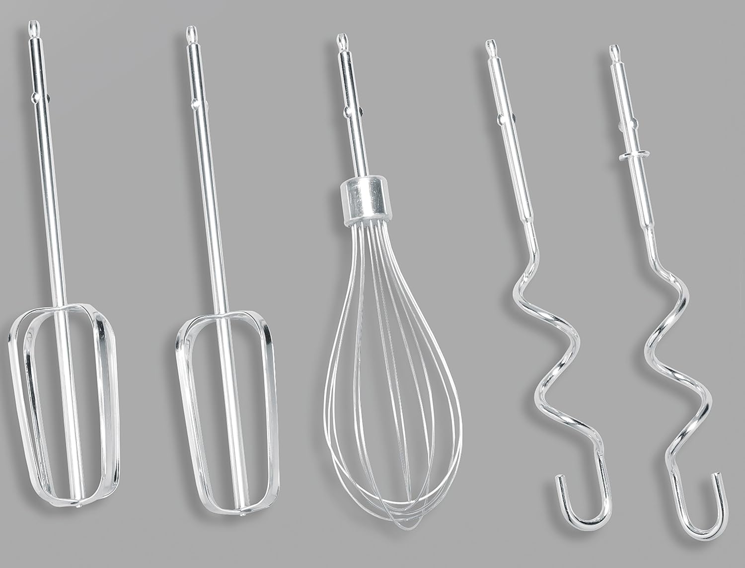 - 5 ATTACHMENTS AND 4 QT. STAINLESS STEEL BOWL. Set includes 2 traditional beaters, 2 dough hooks and whisk, and the 4 qt. bowl is large enough to accommodate your favorite recipes. For easy cleanup, attachments and bowl are dishwasher safe.