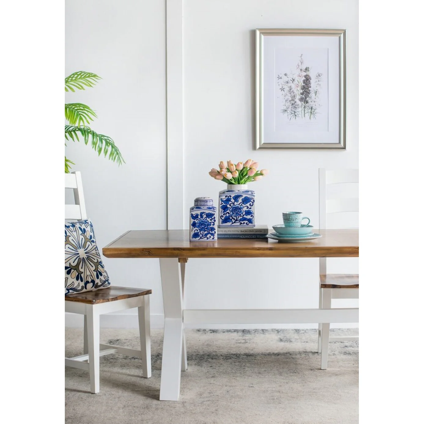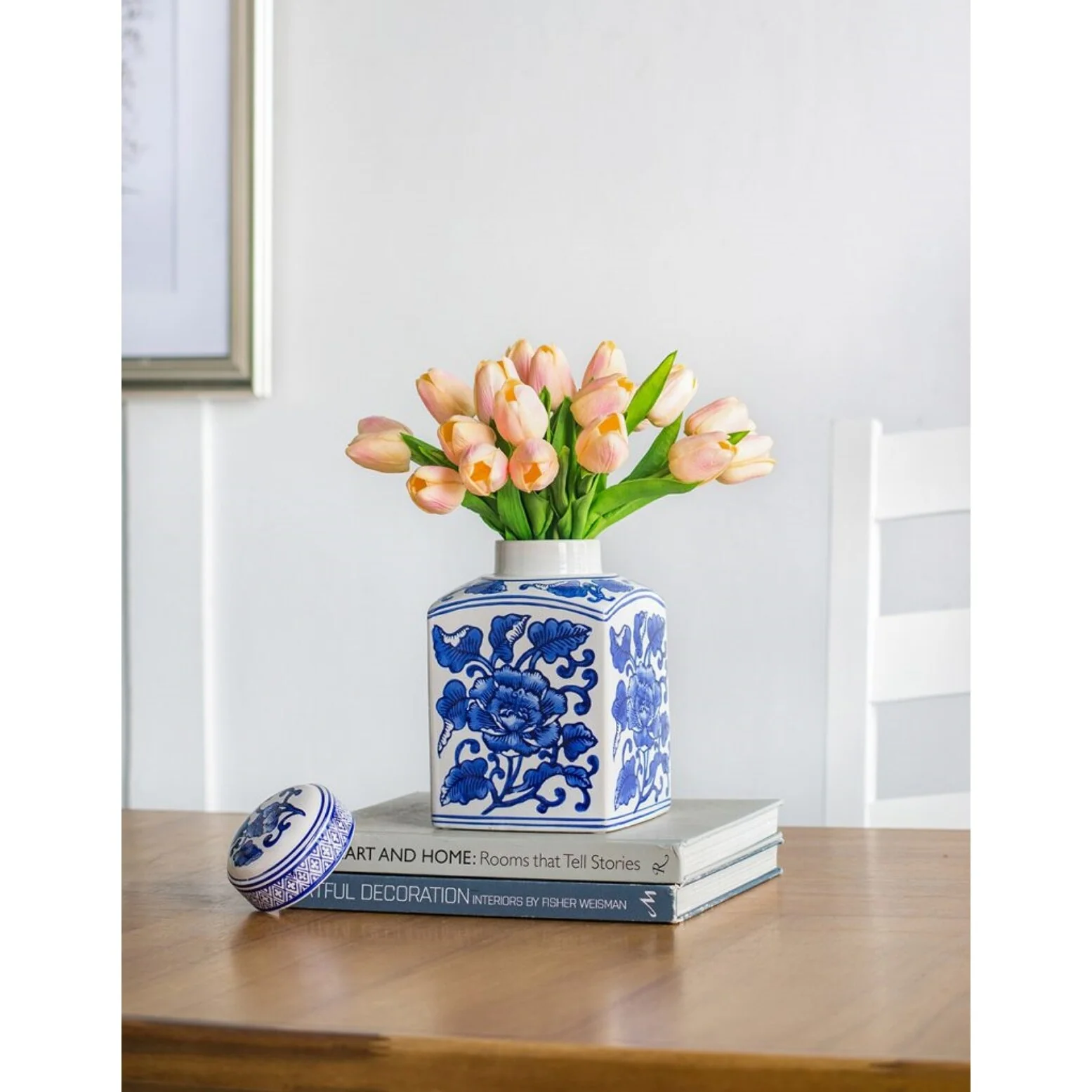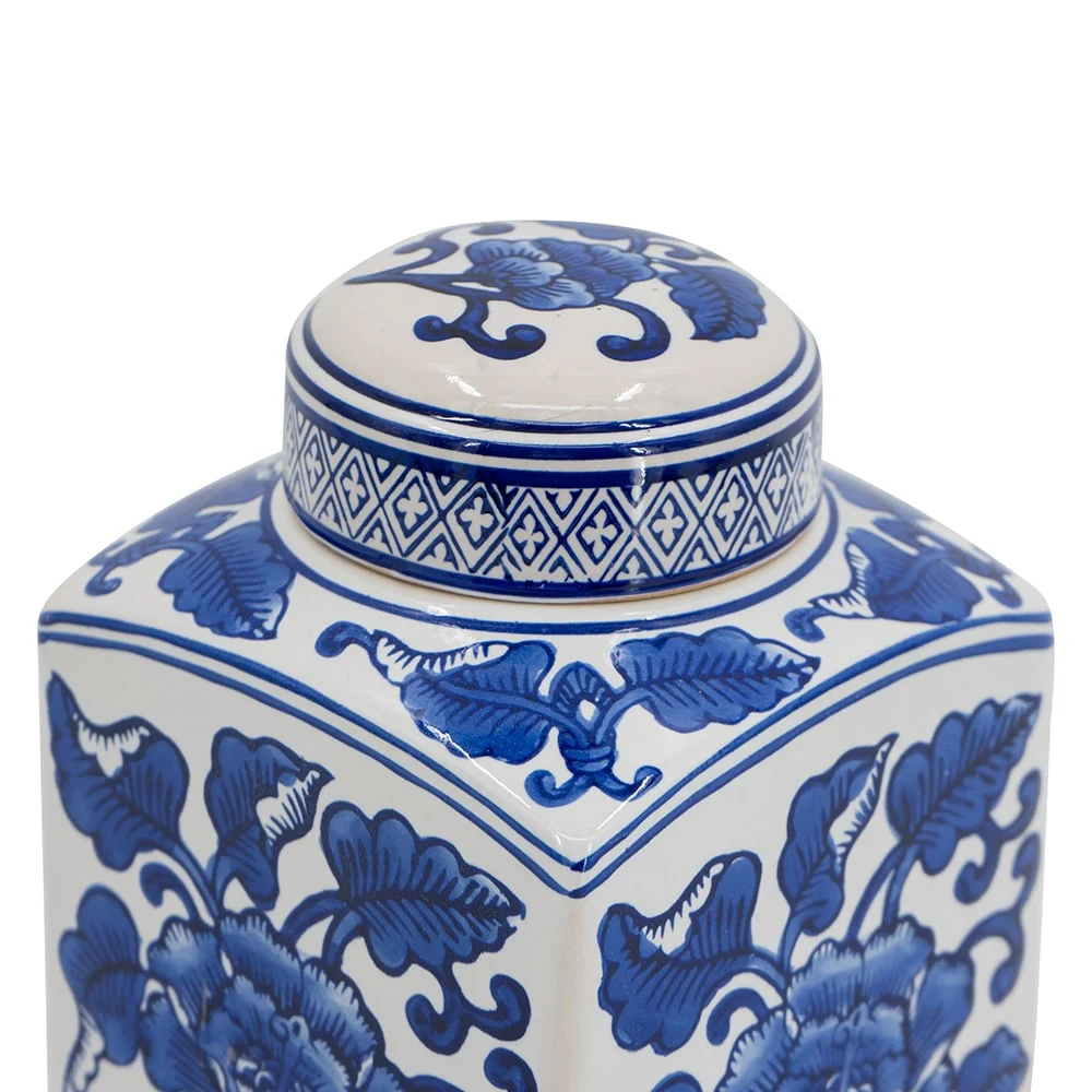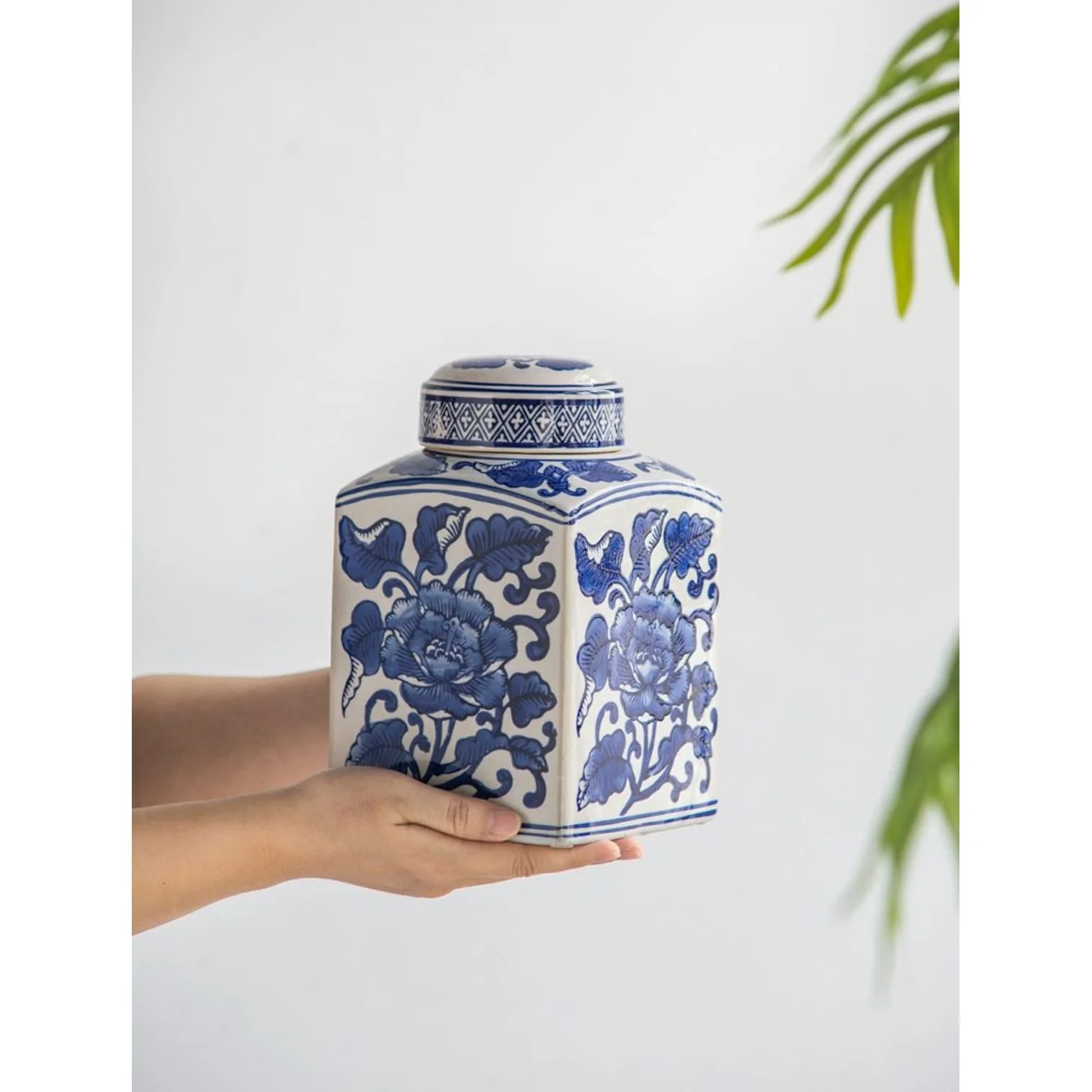 Hand Painted Floral Square Canister – 9" – Blue and White